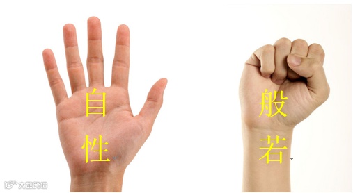 比如我们的手掌是自性,拳头是般若智慧,掌拳都是手,它们是一不是二。