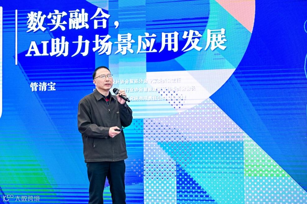 中国勘察设计协会智能分会专家委员会主任、江苏省勘察设计行业协会智能建筑工作委员会会长、南京市建筑设计研究院有限责任公司副总经理管清宝为作了《数实融合,AI助力场景应用发展》主旨报告。他详细分析了数字技术与实体经济融合、数字技术在实体经济(场景生态圈建设)中应用、实现AI在多个领域突破、数智融合助力智能建筑场景物联、数智融合助力城市生命线场景物联等五方面内容,强调要促进数字经济和实体经济的深度融合,运用AI技术,助力应用场景经济的建设发展。