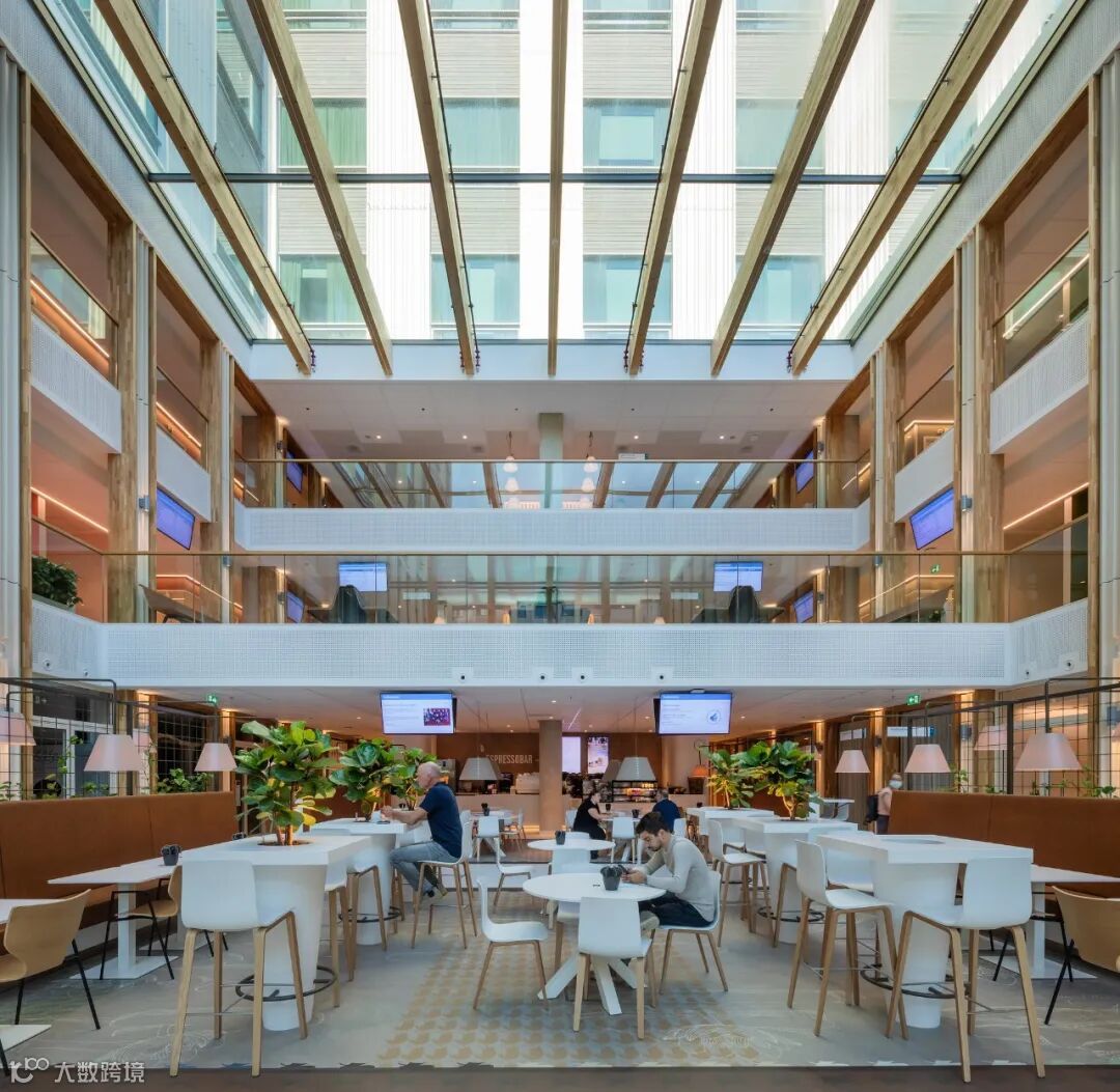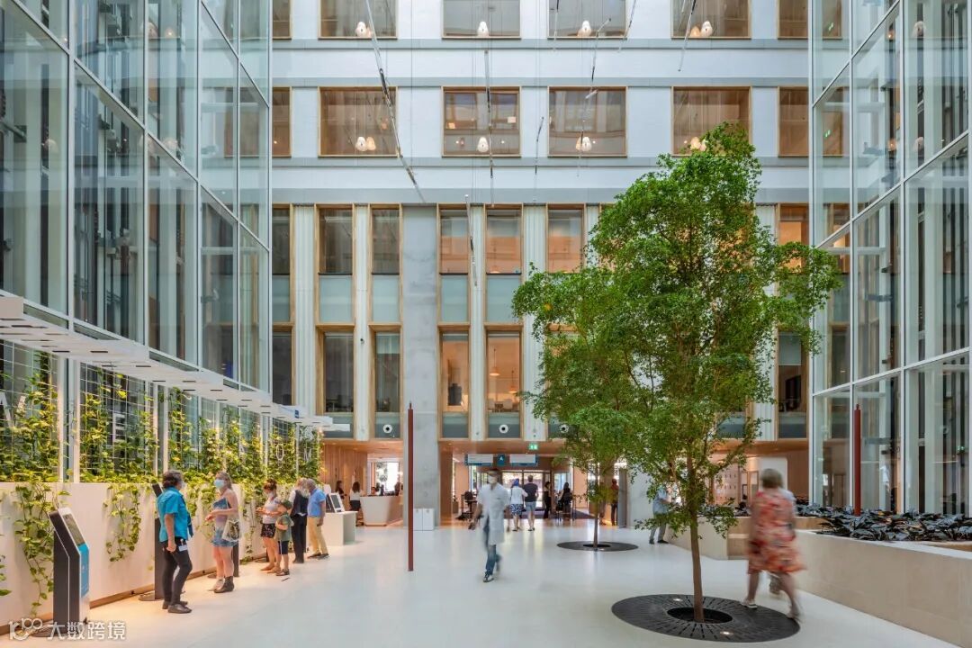 永远明亮,永远有风景。充足的日光、随处可见的庭院花园景观和醒目的景色使每个空间都令人愉悦。在自然光照条件下工作和恢复--整天都是如此--支持生物节律,对身体和精神恢复至关重要。七层楼高的中央中庭将日光引入建筑的中心。成熟的树木和绿色植物将自然引入室内。阶梯式门诊、接待区和餐厅位于玻璃幕墙后面,玻璃幕墙顺利地过渡到玻璃屋顶。这使自然界既可见又有形。动态水平的照明在创造一个愉快和健康的室内气候中起着至关重要的作用。