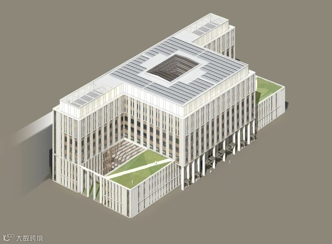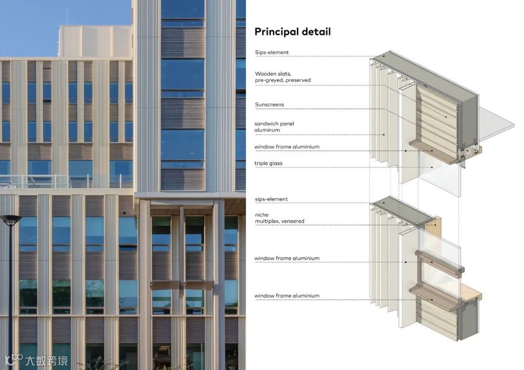 主楼拥有节省材料的主体结构、细长的楼板、大量的预制构件、700平方米的屋顶太阳能板、蓄热装置和节水措施。此外,它不使用化石燃料。此外,还采用了亲生物设计,在可持续性和健康的基础上组织其内部流程和设施采购。