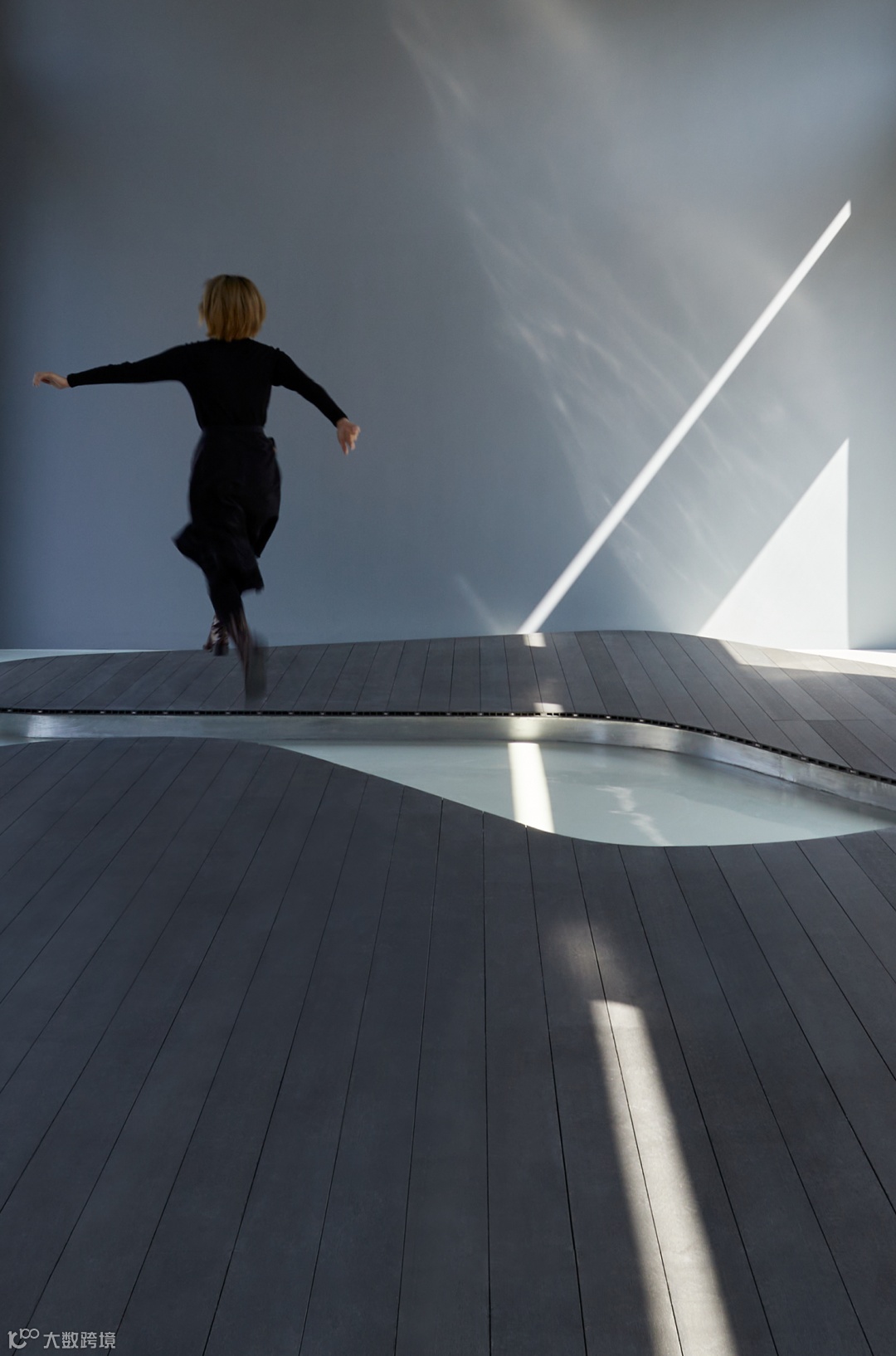 这处6米*12米的不规则矩形空间,原始格局十分简单,中规中矩。设计师为之植入一座异型舞台,使室内平面与通透的立面相呼应,并增加了强烈的动线变化,从而形成影像、视线、身体与环境的四维互动。