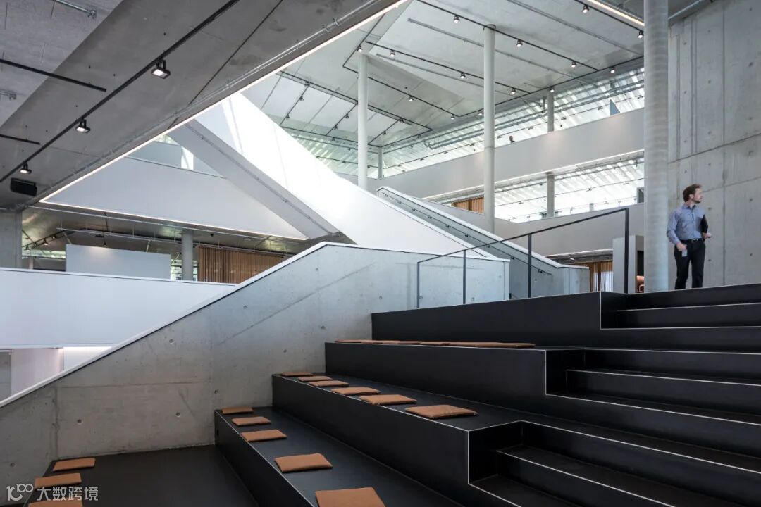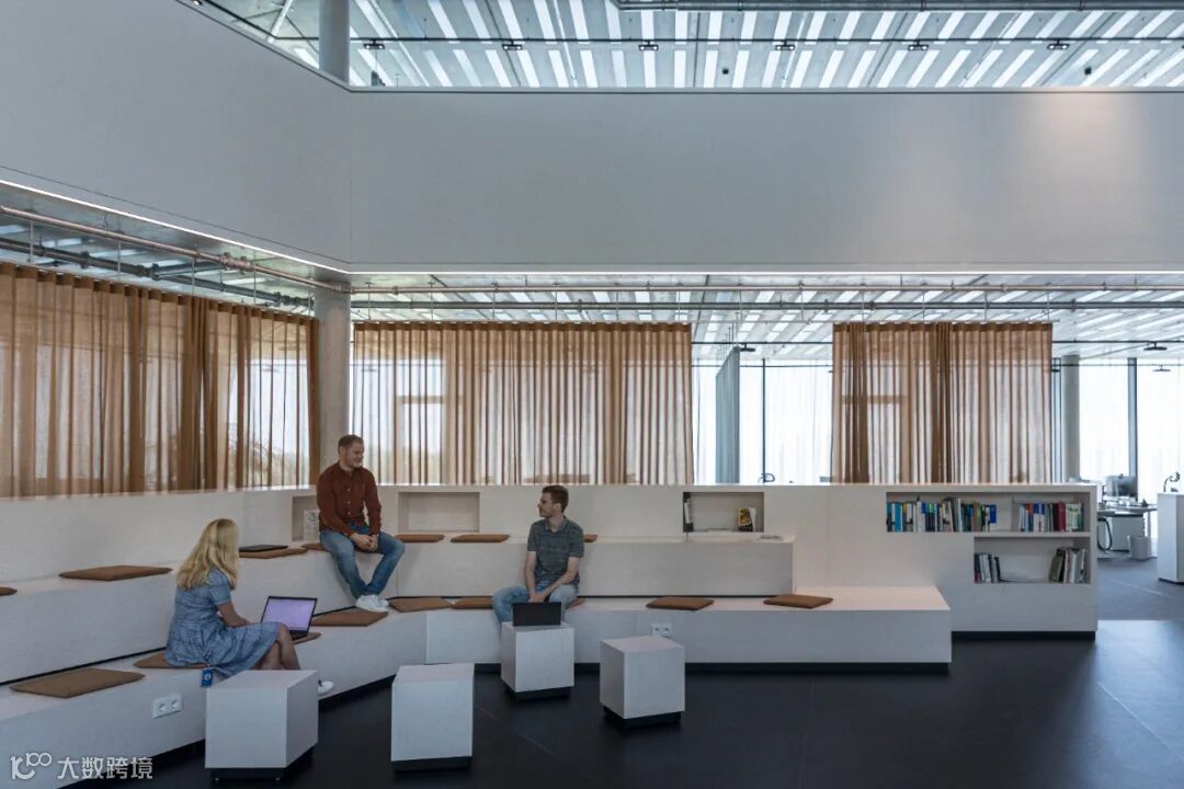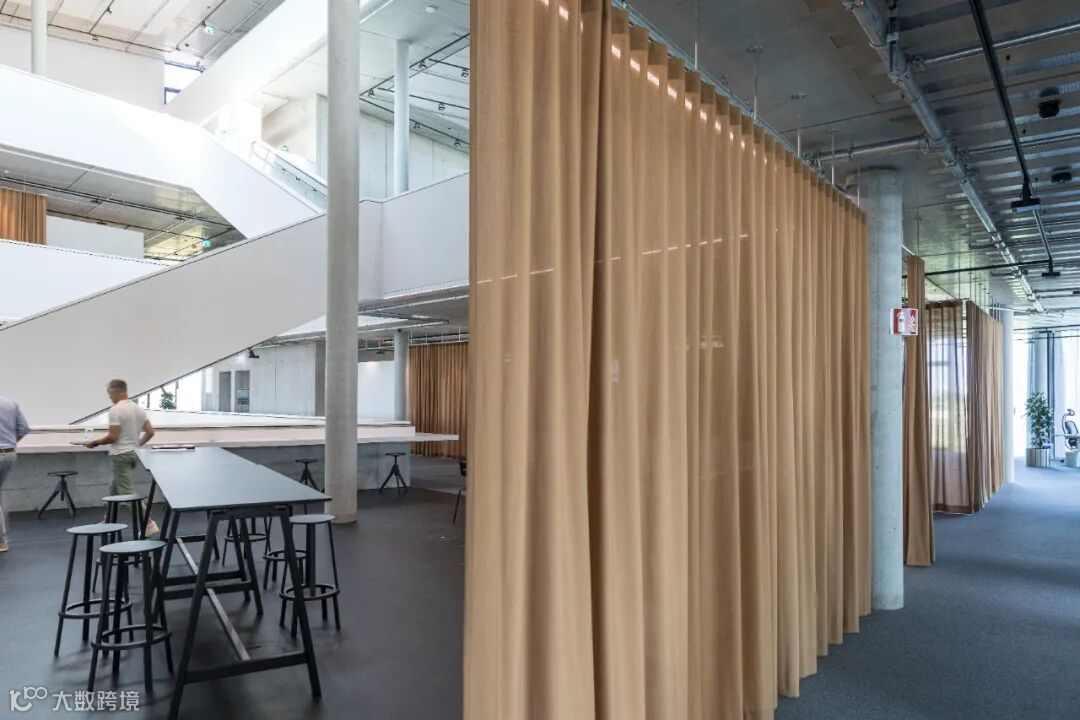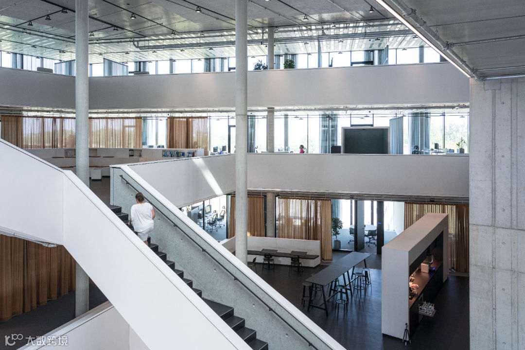 相较于与时尚、简约的外观,室内采用了原始、裸露和天然的材料。譬如裸露的混凝土、未完成的阳极氧化表面和可见的金属板。工作空间使用了自然色彩和包括木材和织物在内的天然材质。面向中庭的所有表面都涂有白色的声学覆层,可以抑制声音并强化漫射的自然光线。青铜色窗帘可作为灵活的室内隔断,创造出适应性较高的空间环境。