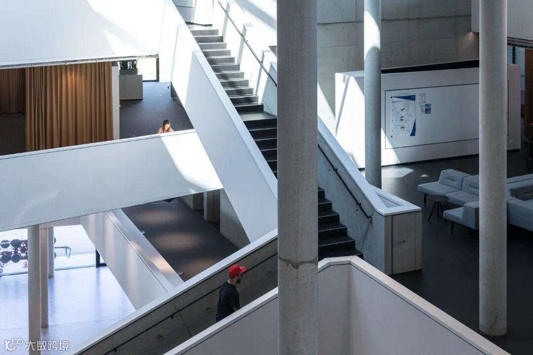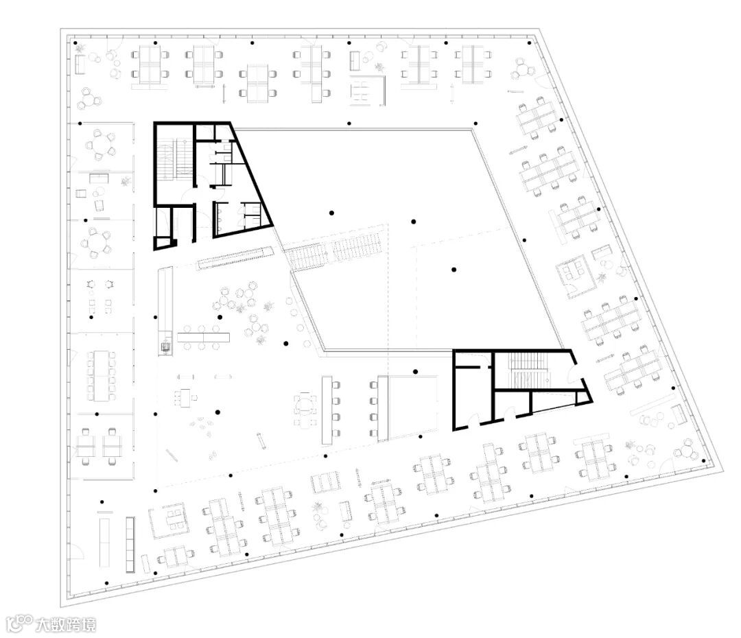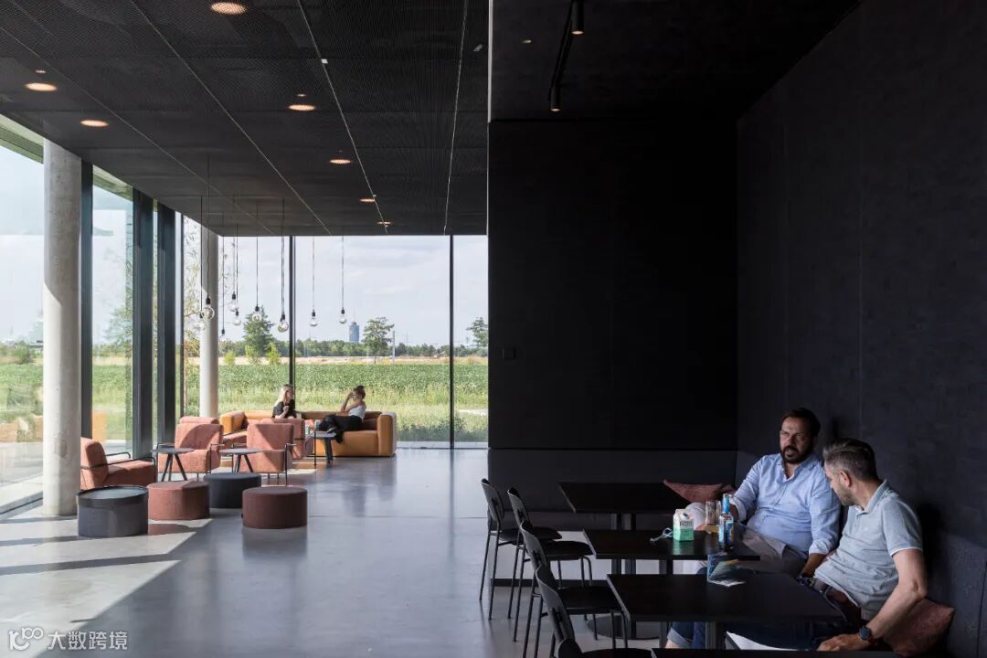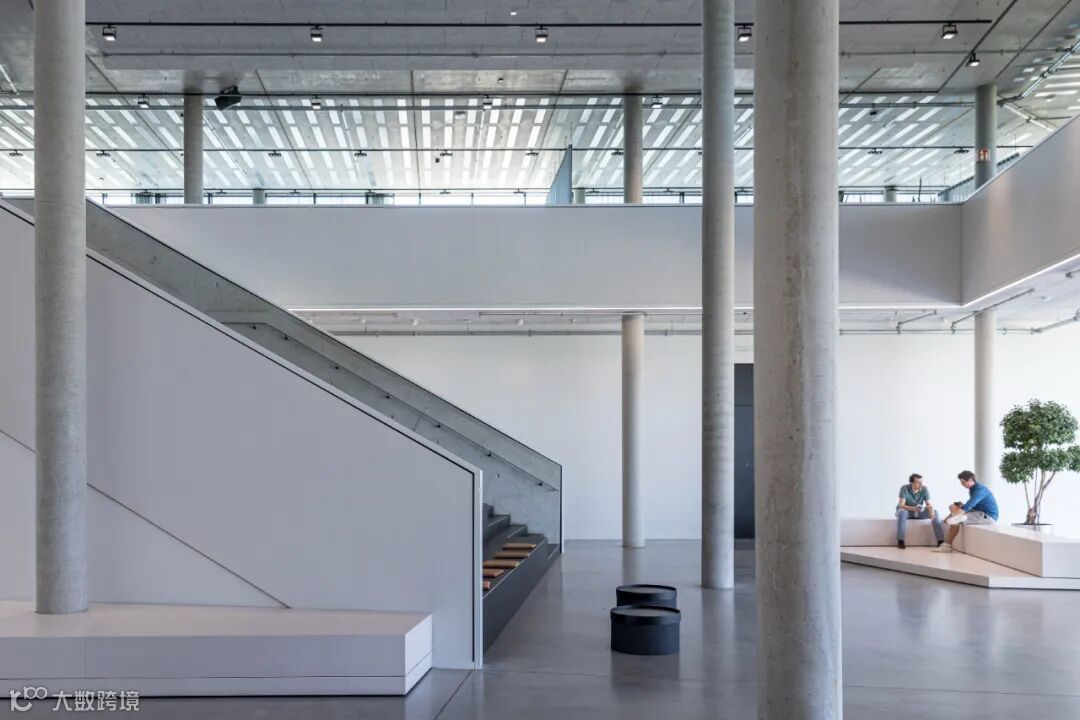 相较于与时尚、简约的外观,室内采用了原始、裸露和天然的材料。譬如裸露的混凝土、未完成的阳极氧化表面和可见的金属板。工作空间使用了自然色彩和包括木材和织物在内的天然材质。面向中庭的所有表面都涂有白色的声学覆层,可以抑制声音并强化漫射的自然光线。青铜色窗帘可作为灵活的室内隔断,创造出适应性较高的空间环境。