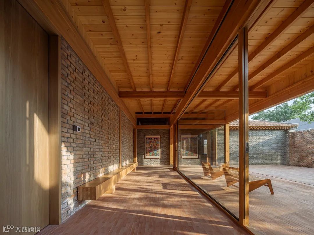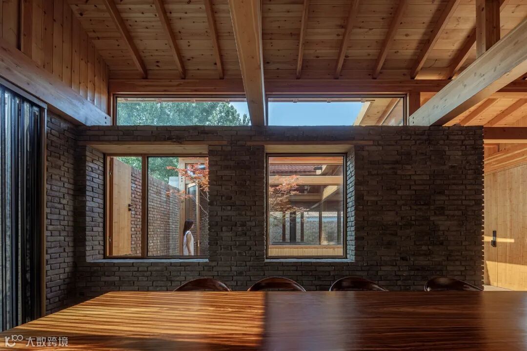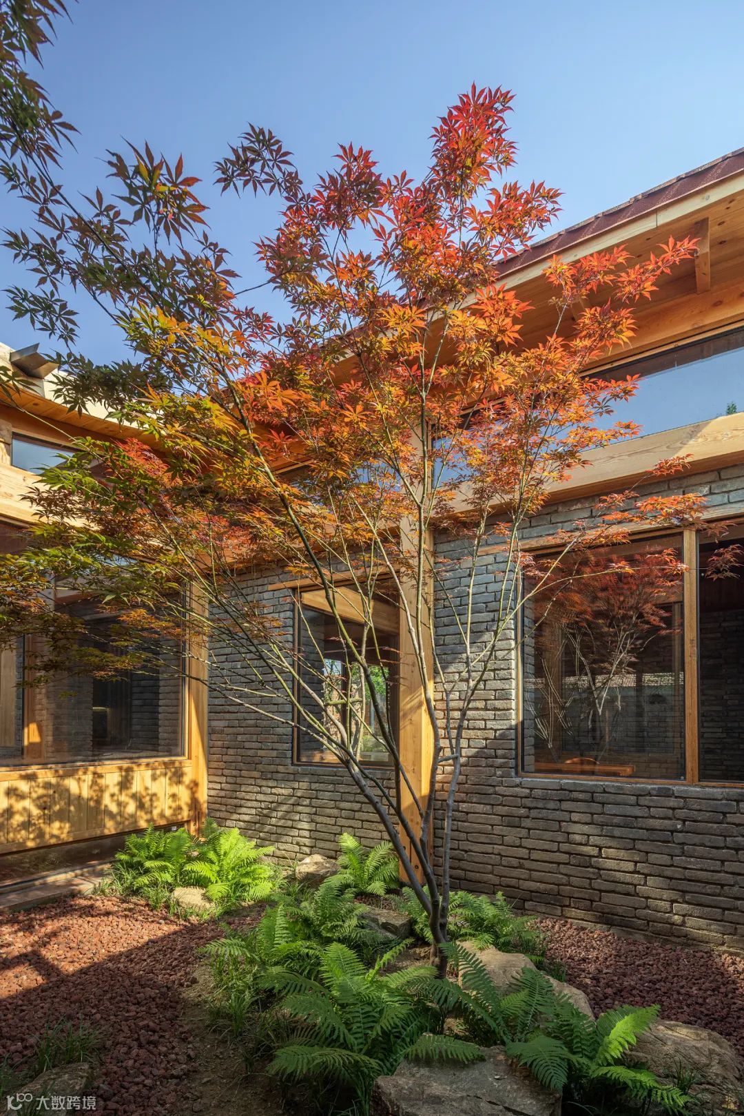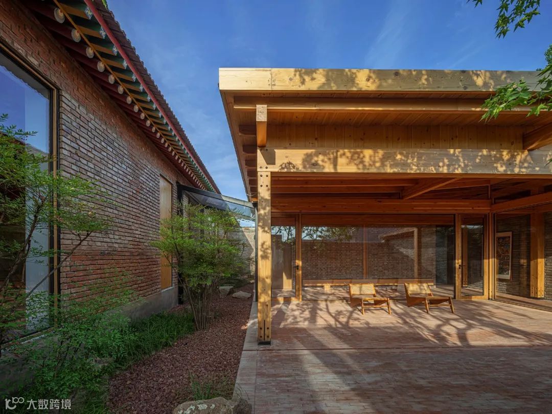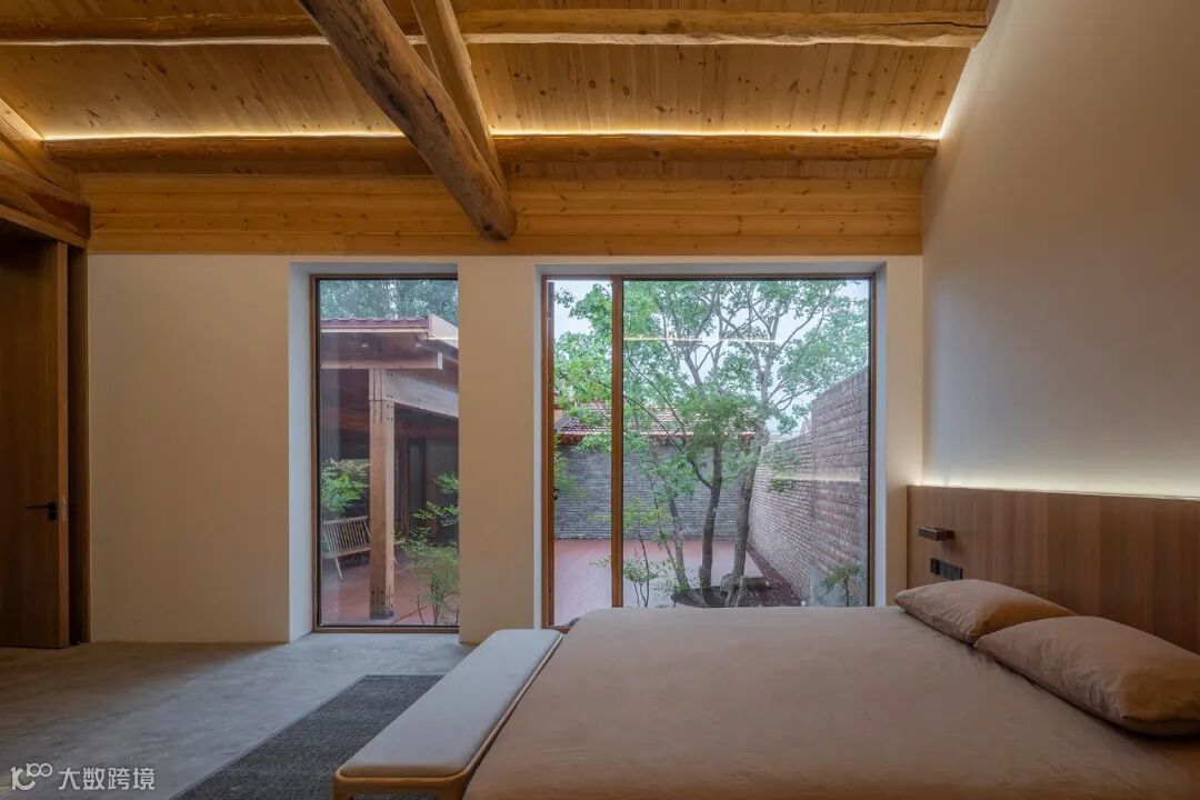继续向后进入卧室区,北房与木屋之间通过玻璃廊相连,自然区隔出一个窄院。三个卧室均可直接面向室外景观,满足采光通风需求,同时视线避免干扰。不同庭院的设置,让室内各个角落都焕发着自然的生机。