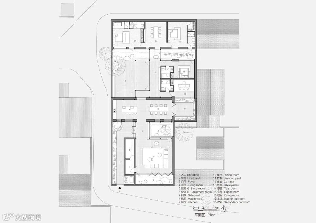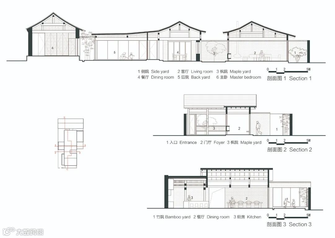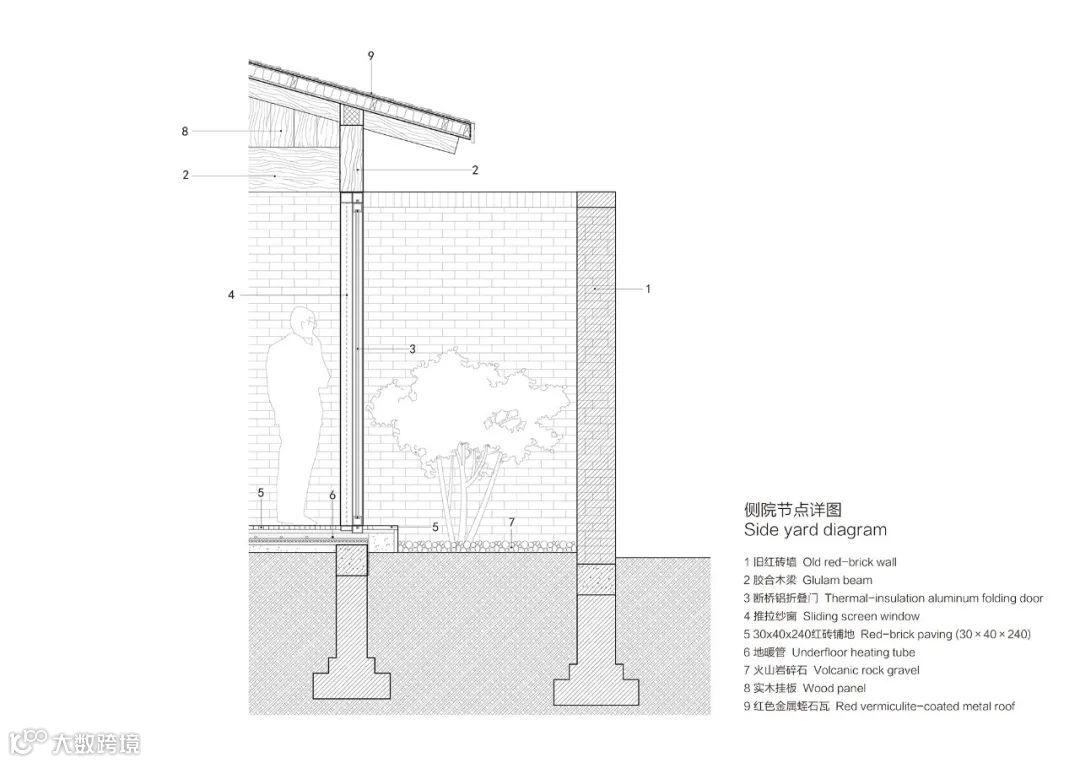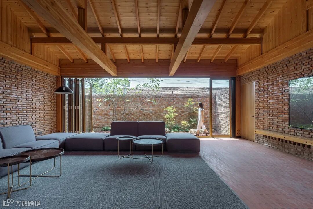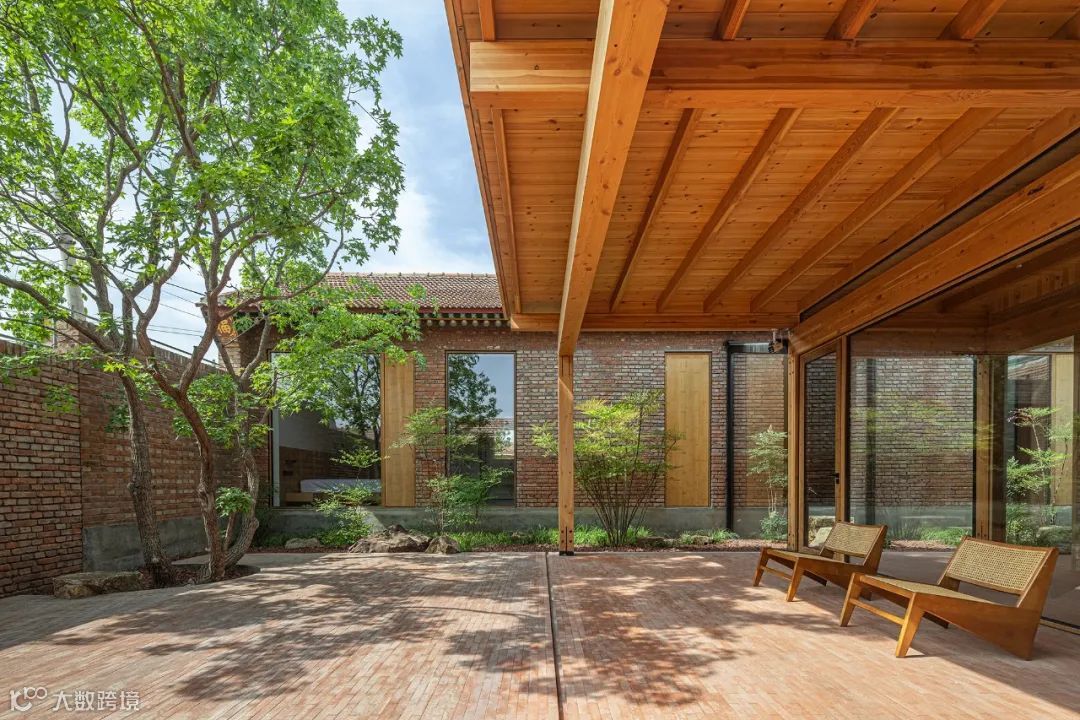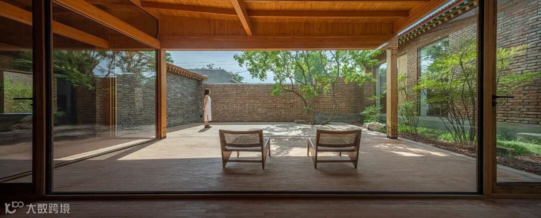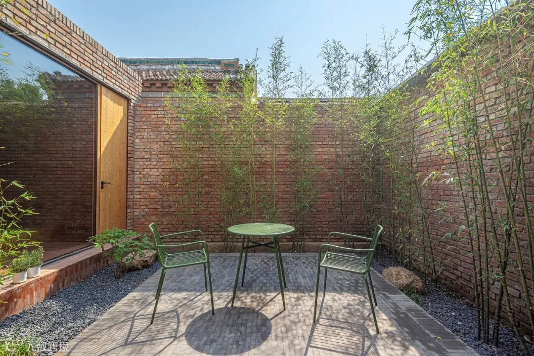 客厅与南侧院墙留出侧院,院中植树置石,天气晴好时,客厅折叠门可以完全展开,含院入室内。