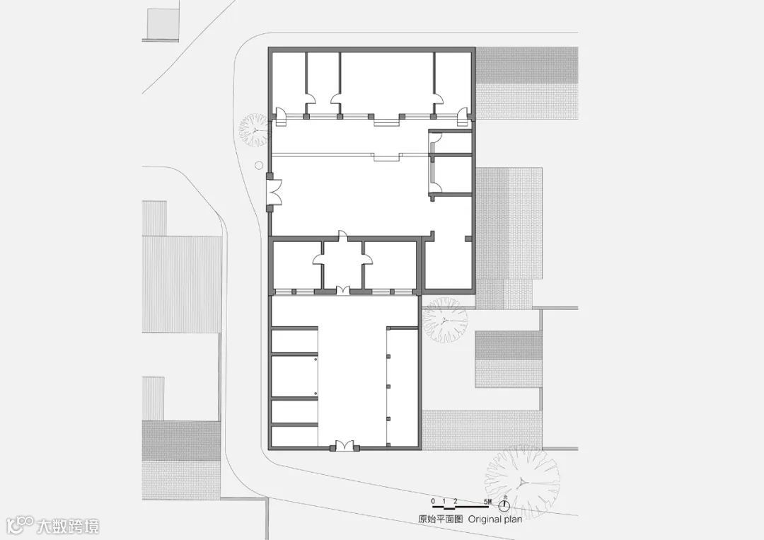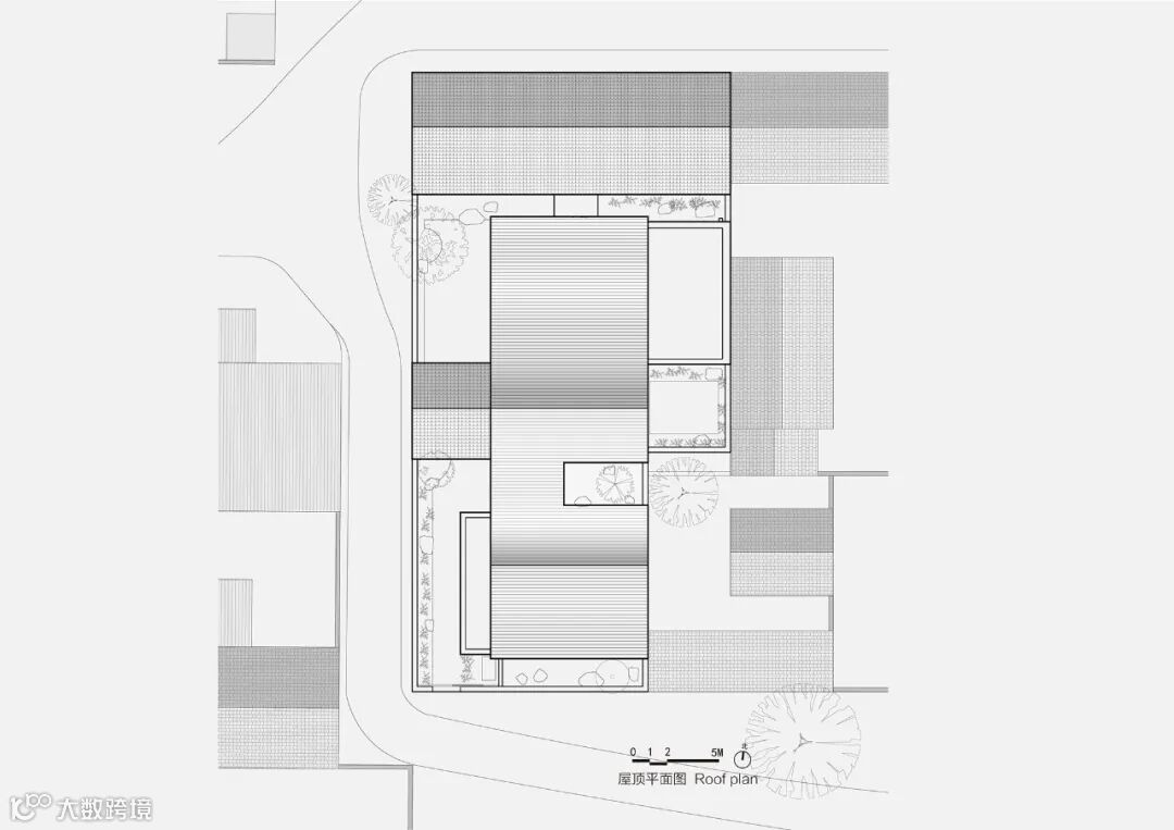 向北进入旧屋,餐厅、厨房一字排开,旧木屋顶与新木构屋顶相互对照。餐厅向外与邻居家院墙形成一处竹林庭院,就餐活动可延伸到庭院中,置身于竹林中饮食品茶。通过餐厅即进入后院,此院为主要室外活动院落,通过半室外走廊过渡到庭院当中,院中植有大树。可在外廊中小憩,也可在大树下聊天。
