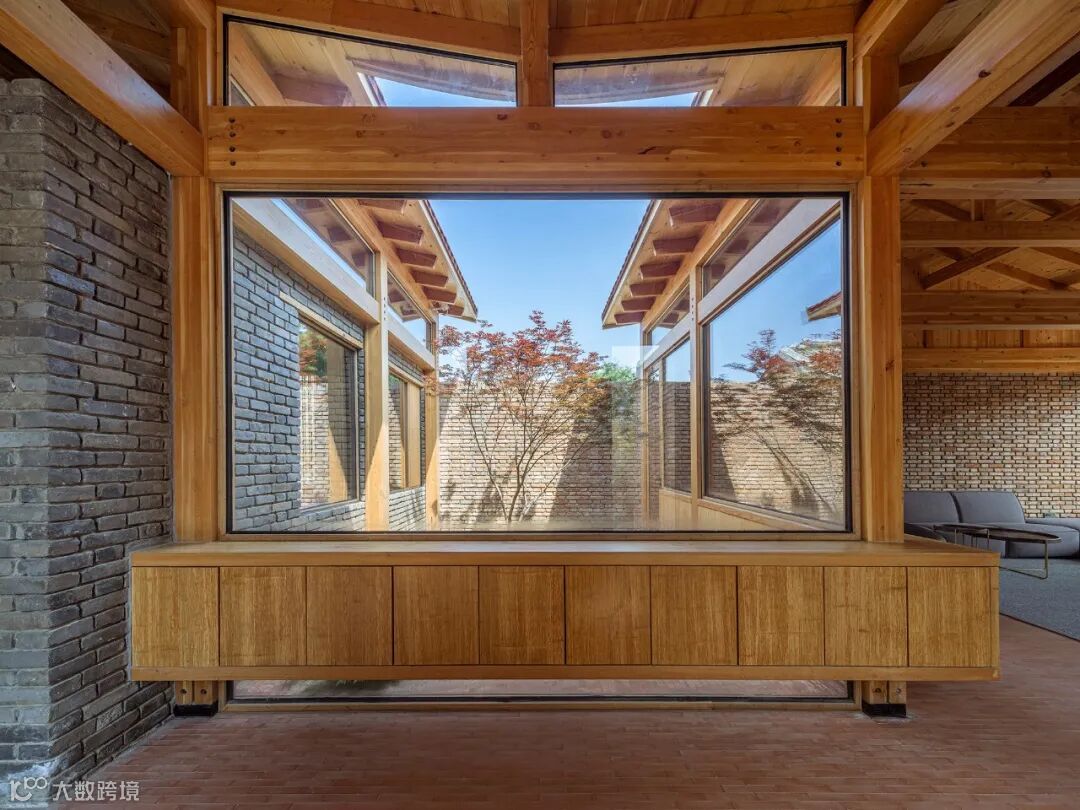 门窗采用固定中空玻璃与竹钢板材可开启扇结合。实体开启扇可以满足通风需求,而固定玻璃窗保持取景的完整性。室内固定家具也全部由竹钢板材定制而成。胶合木、竹钢和旧的木梁形成了木料间的新旧混合关系。