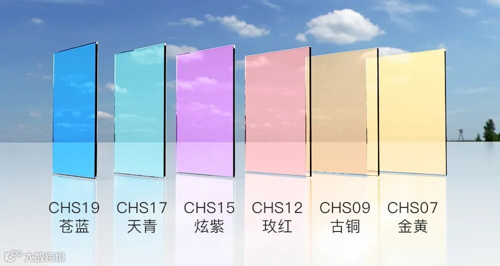 彩虹色系列镀膜玻璃包括:CHS07(金黄色)、CHS09(古铜色)、CHS12(玫红色)、CHS15(炫紫色)、CHS17(天青色)、CHS19(苍蓝色)。整个系列涵盖了从金黄到苍蓝6个颜色,色彩炫丽、稳定,远超市场主流蓝灰色系镀膜产品。
