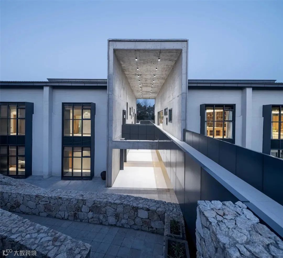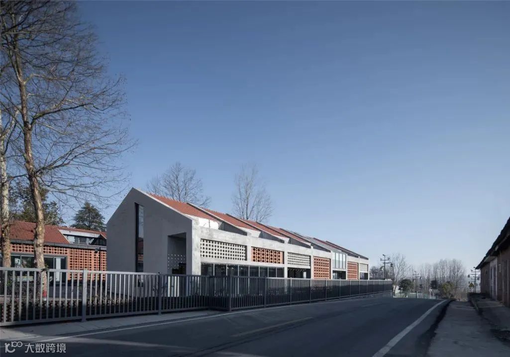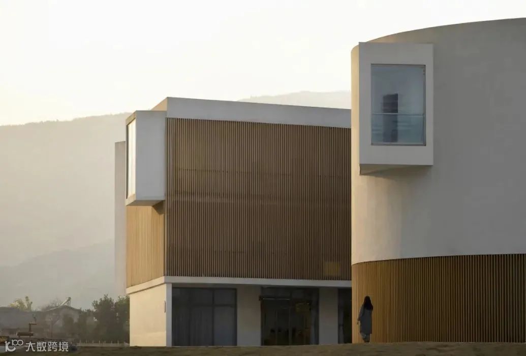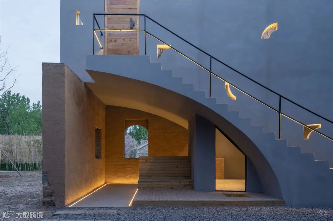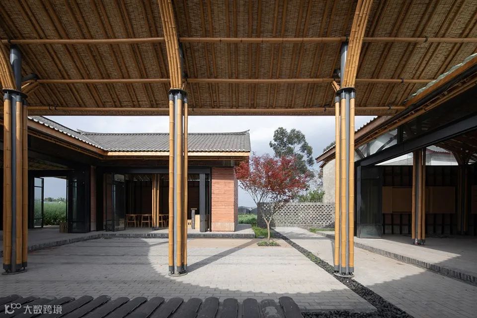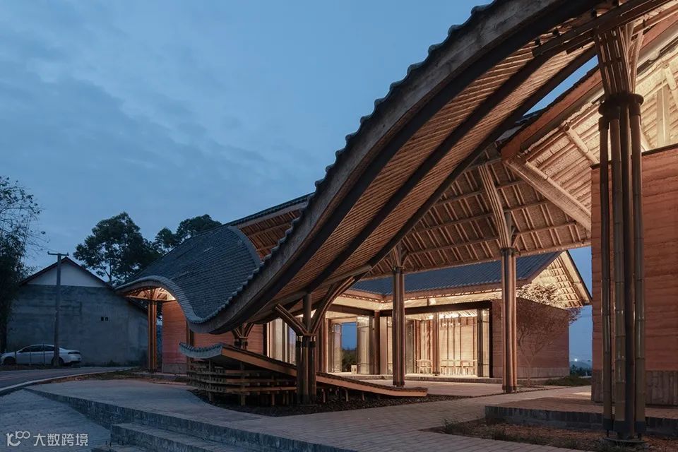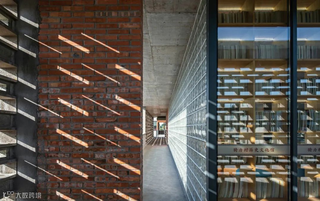 在材料的选择上,通过就地取材泥、沙、砾石组成的夯土墙,构建朴素的外墙立面,通透的玻璃瓦与青瓦的相结合,形成了现代元素与传统元素的冲突与碰撞。