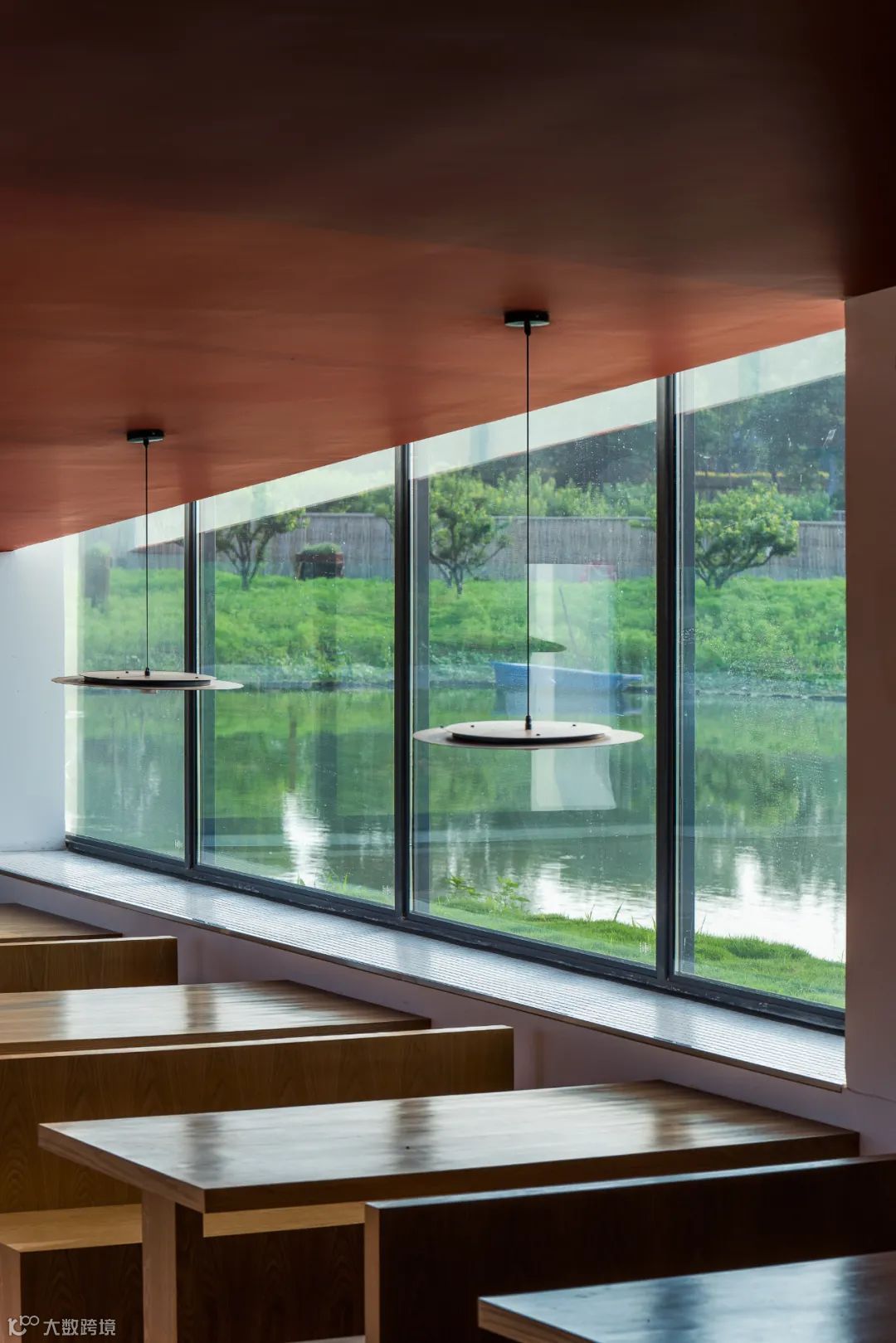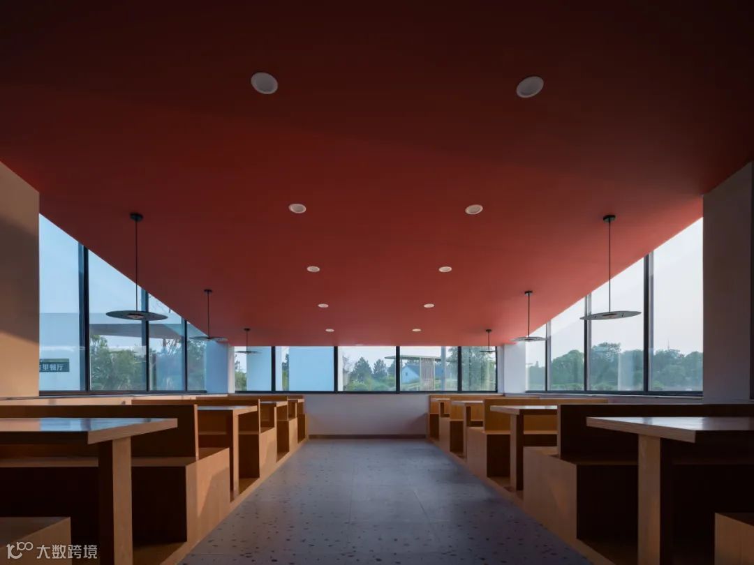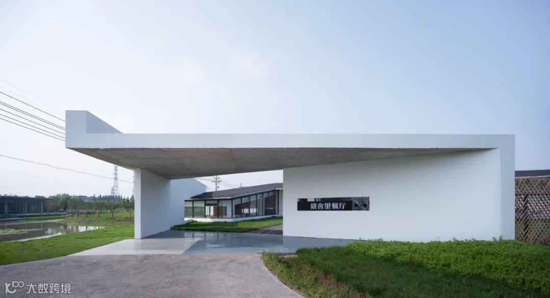 餐厅由两个单坡斜顶空间旋转六十度后,主体一角“破洞而出”,若湖上石舫。隔湖而立,可从墙体上的梯形长洞中远远窥伺到餐厅的一隅,见到一个“不完整”的内部,同时建筑西南角的入口门仿若巨大的“雕塑”,偌大的悬挑结构在临湖侧即曝露在观看者的视野之中,使人欲往近处探究。