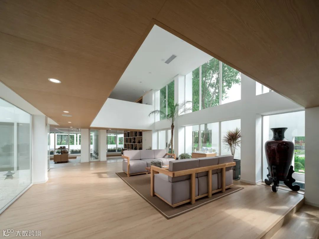 在空间设计上,把原有建筑比较密闭的空间,结合现有功能,重新做了梳理与延展。让原本纯粹的内向型院落,变成了内外集合的院落,同时新建筑维持着原有的样貌关系。远眺这个建筑,穿过植物景观,能看到它盘绕而下跃然而上的屋顶,和自然的流线迂回。