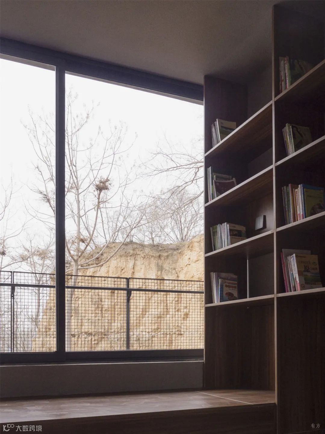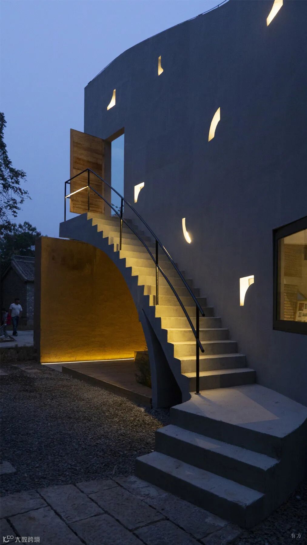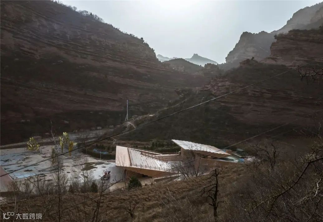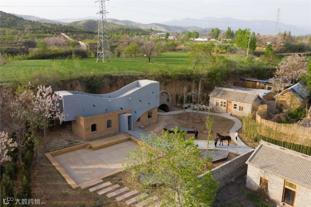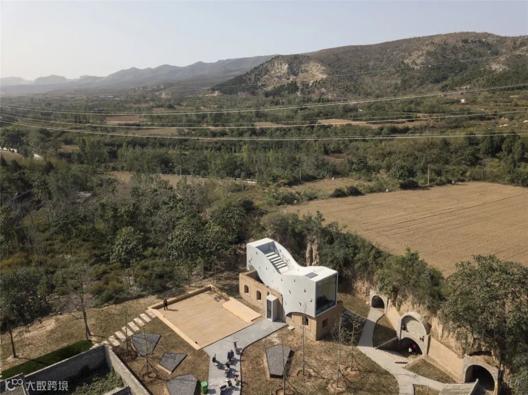 建筑的外形与内部空间顺应地形的状态而展开。屋顶以起伏的轮廓呼应着地形与远山,而起伏地面在屋顶自然形成室外阶梯平台与滑梯。跃升过老屋的曲线剖面沟通起首层入口、二层阳台与屋顶平台。室内为可以兼作小型论坛放映室的阶梯图书馆 。建筑蜿蜒的平面及周边路径,则成为周遭迷宫般窑洞系统的延伸。