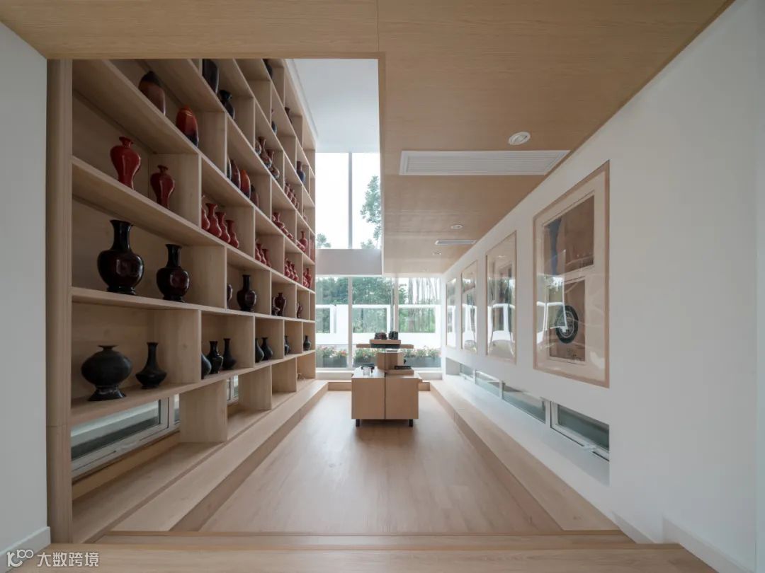 簇群形态在一楼及二楼的南侧相应的转变为3个通高的展览空间,工作室及茶室,西侧为通高的入口大厅,北侧为厨房及体验室。