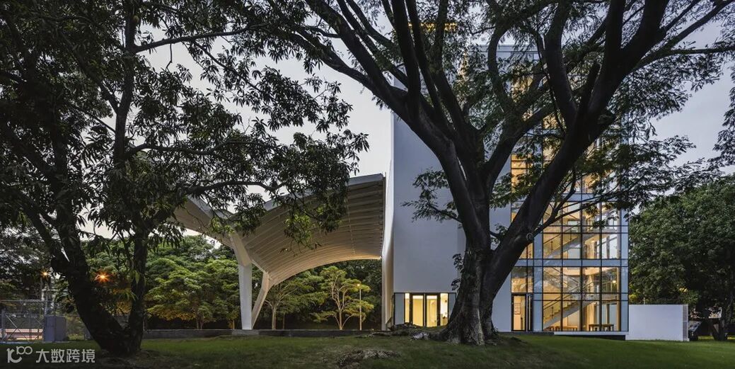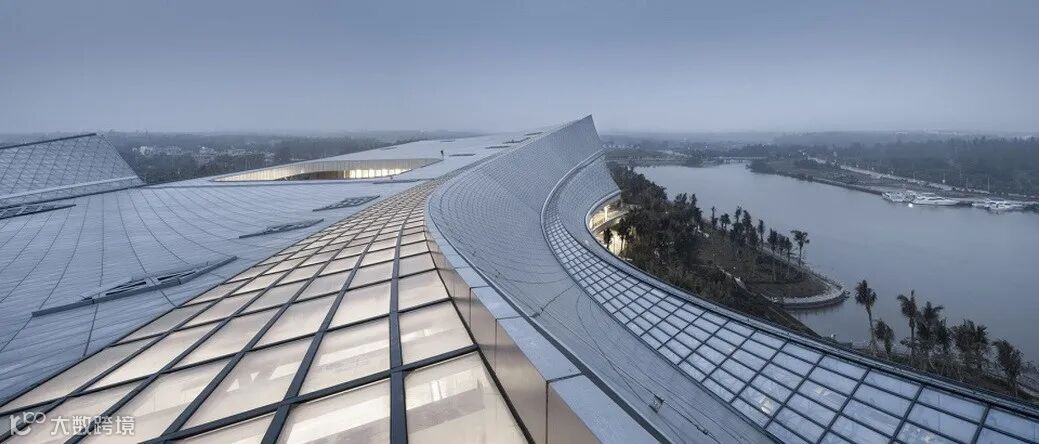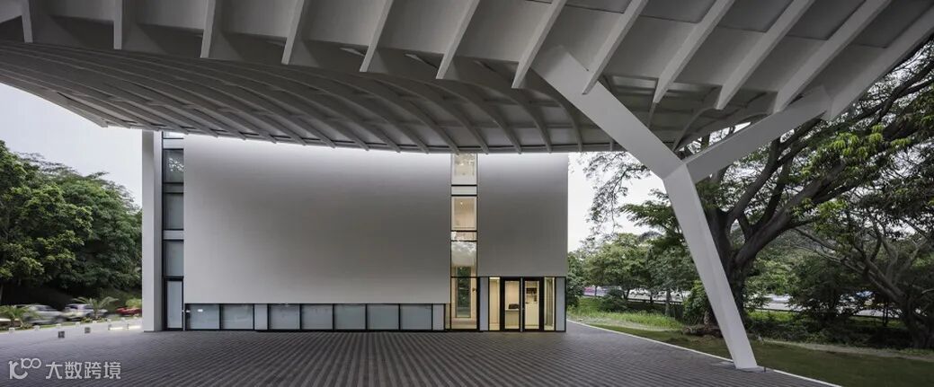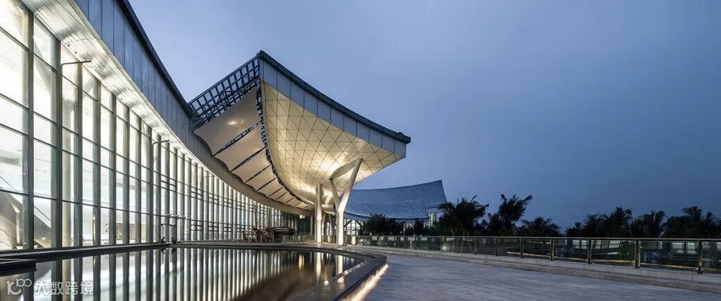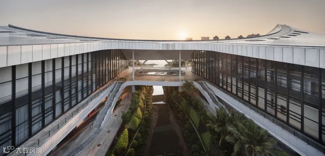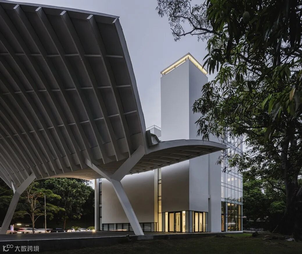 建筑形体在遇到场地内横贯的一段红树林湿地时,采取了连廊和屋顶双层最大达60余米的高跨方式,寻找到建筑与环境的双赢,获得了难得的半室外景观空间和新奇的视角。