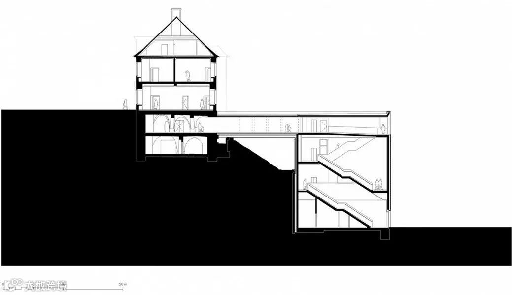 设计为博物馆赋予了一个由北向南逐步下降的台阶式体量:从既有建筑的地下一层延伸至建筑主体所在的鲁尔大街。在通过白色的楼梯井不断下降的过程中,建筑的体量逐渐增大:从上层的起始展区到夹层的多功能厅,再到最后的大型主展厅。
