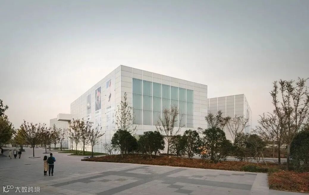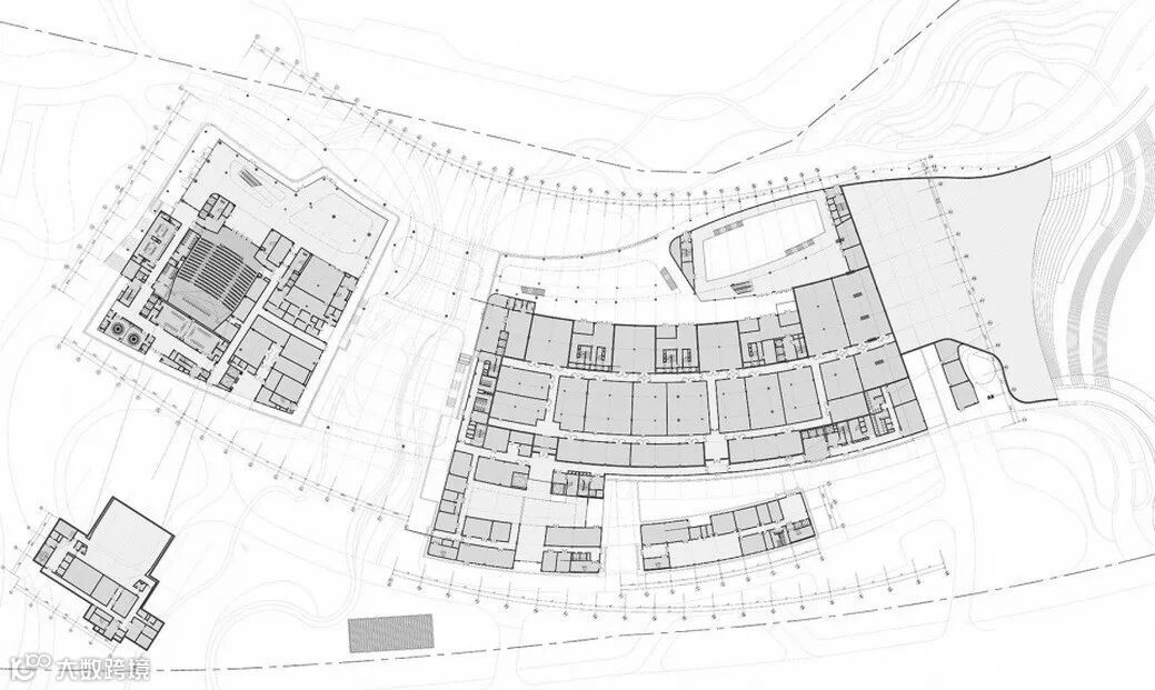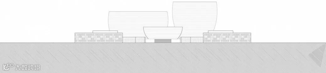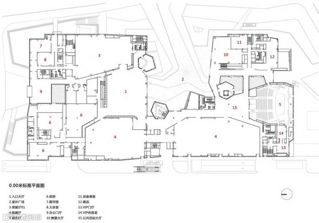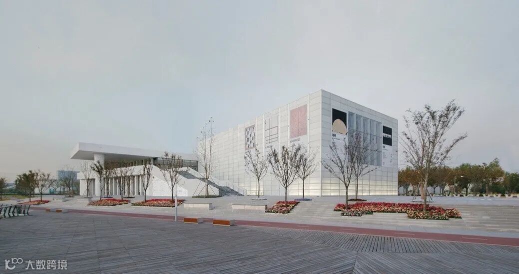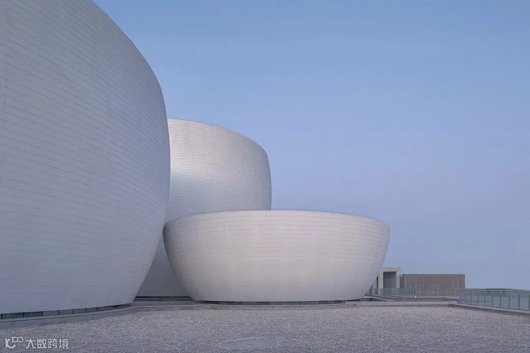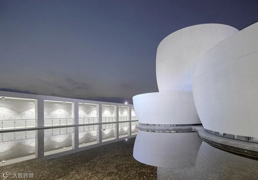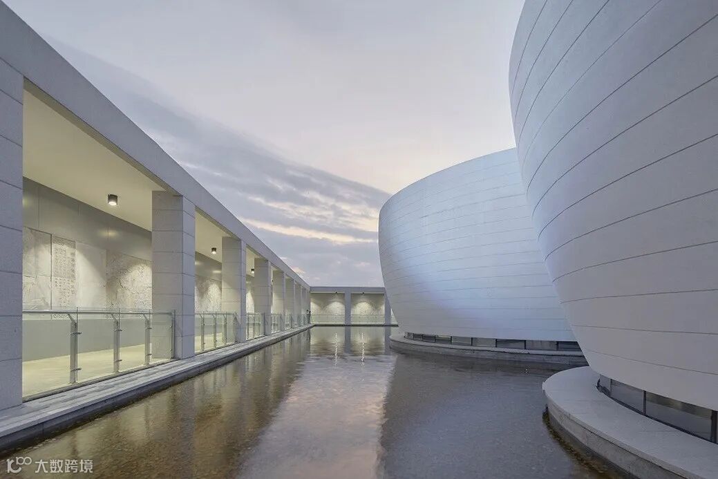 对公众开放的展览空间像七件质朴的瓷器,漂浮在水面之上;水池下面是连成一体的入口和主展厅;对称但似是而非的宽大台阶连接着环廊、水池和北侧的广场。