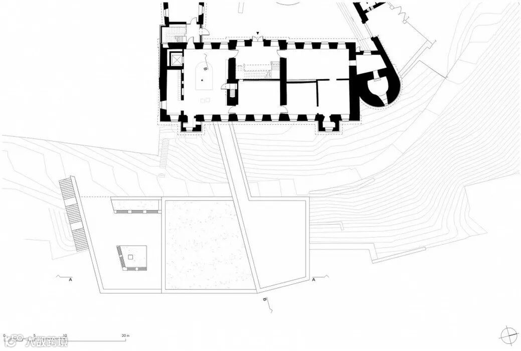 办公空间和设备用房像一道城墙,把博物馆从周边农田及低矮破旧建筑形成的杂乱日常环境中剥离出来;这道城墙的另一侧是开放的敞廊,围绕着一个从地面抬高的水池。