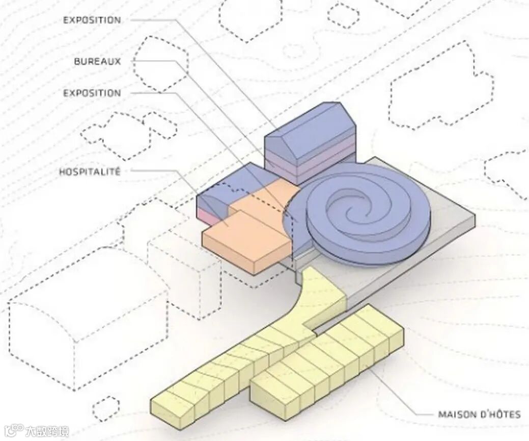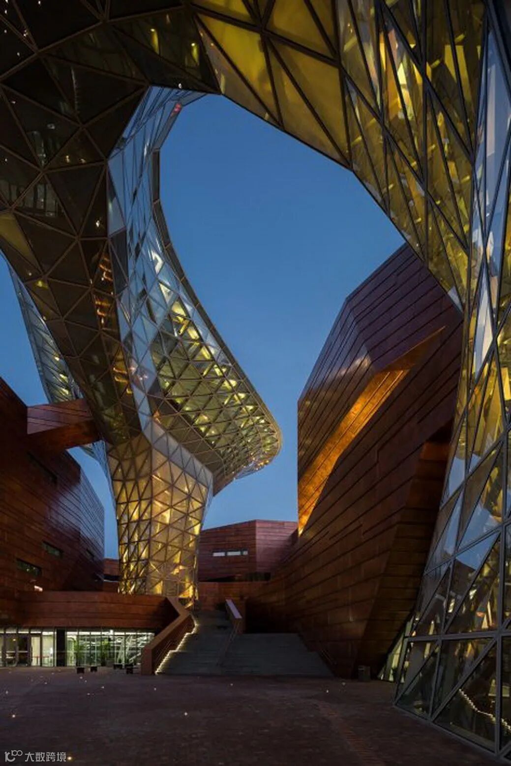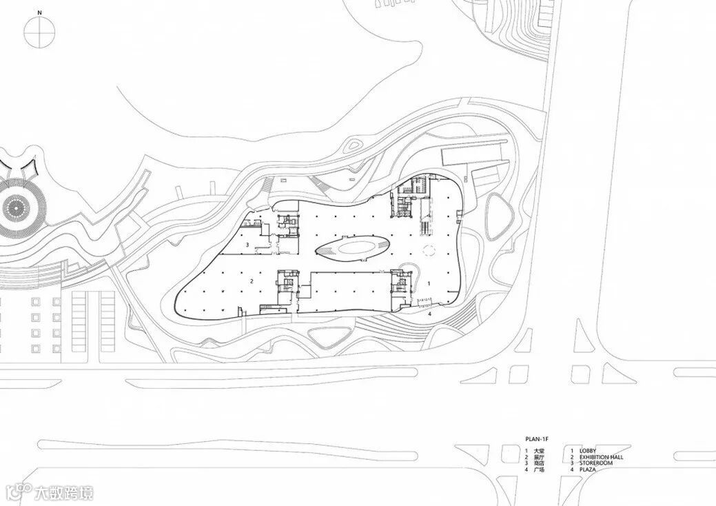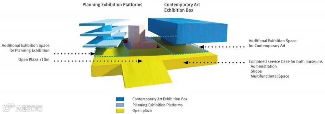 多面向量体的漂浮建筑,如同真空妙语般简单却又不简单的悬歌,中空的体态包容“现代”、“过去”与“未来”展厅,开放的基地与公园融为一体。