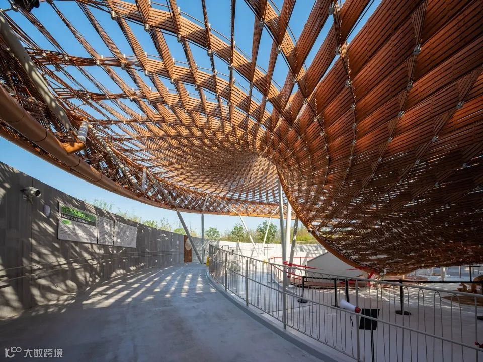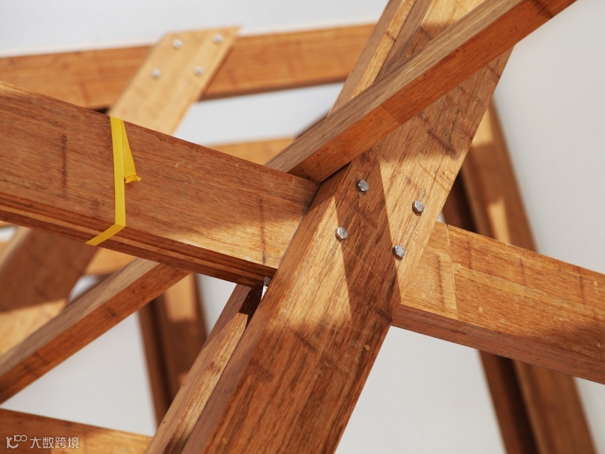 在建造方式上,选取30mm宽、5mm厚,2.5m长的竹钢片单元,竖向上在双层索网之间垒叠填充成面,曲面展开方向则沿钢索拼接成与之等长的“经纬线”。