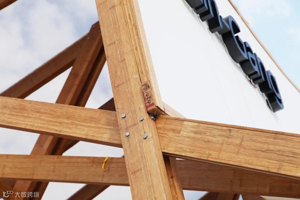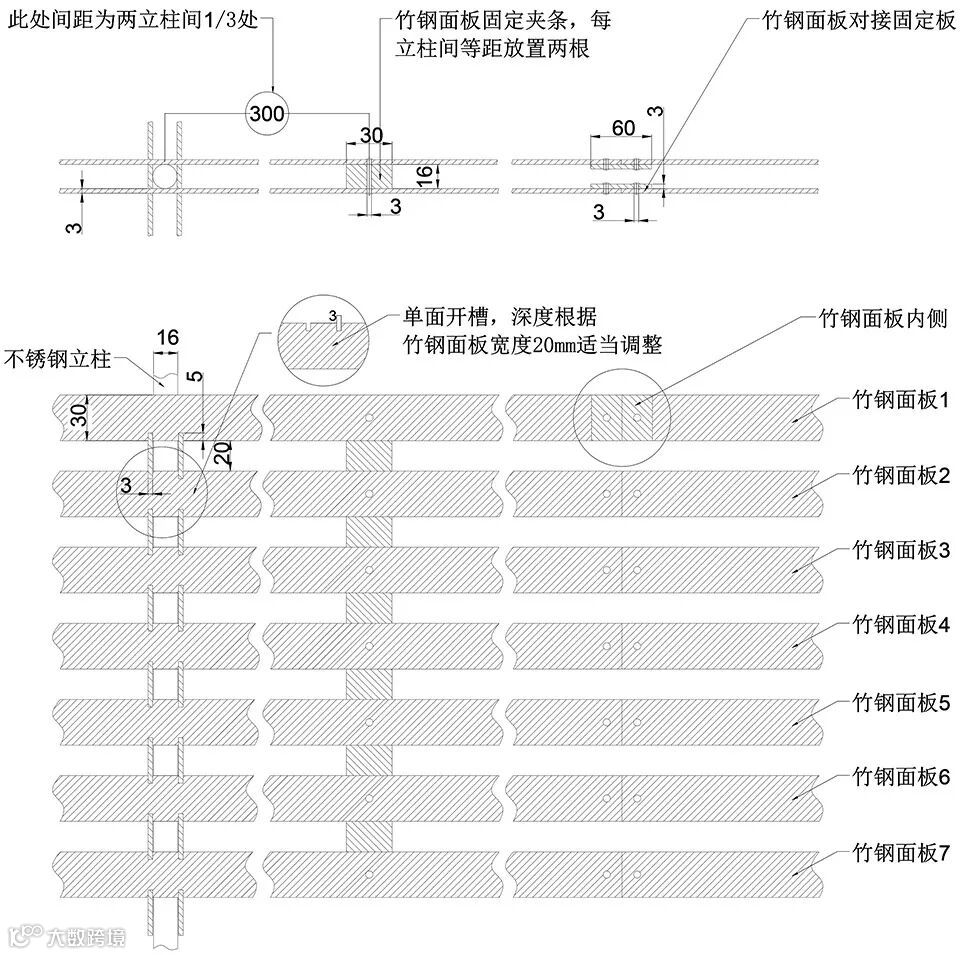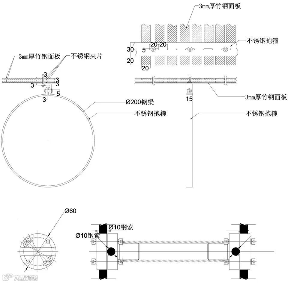 同时,每根“经纬线”采用平行排列的双层竹钢片,间隔设置加固条,并在交叉节点处开企口固定,完成两个方向竹钢片与索网连接节点的咬合固定,形成一体化的建构表皮,既展现了张拉索网的结构美感又显示出新型绿色竹材在当代建筑中的创新应用。