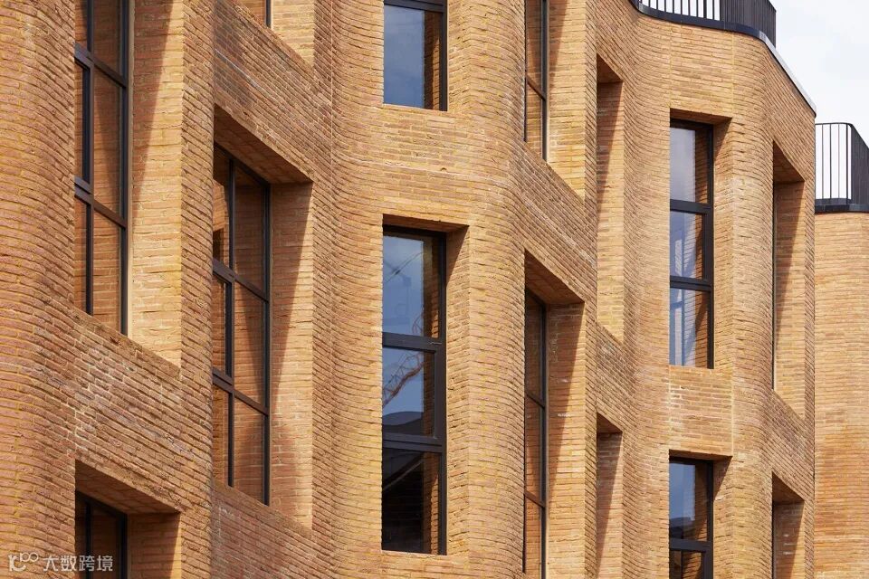 比如鼎石物流办公楼建筑的前广场、首层外墙和二层楼面均使用了红砖这一该地区历史建筑较为典型的材料,结合办公楼建筑形态构成了由南向北连续起伏的砖肌理地表。