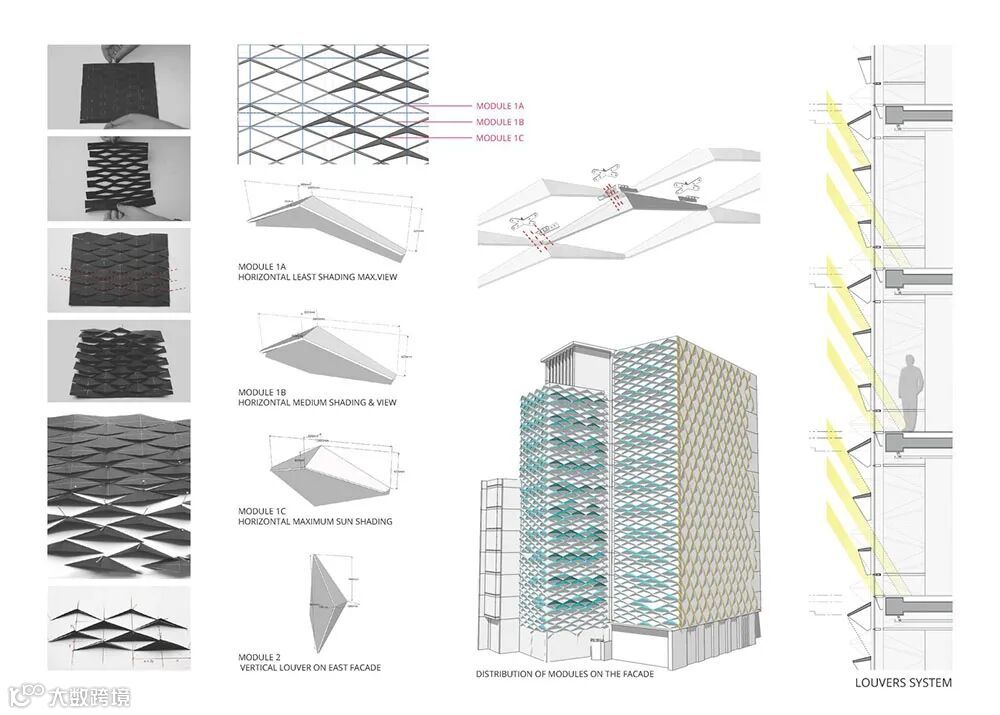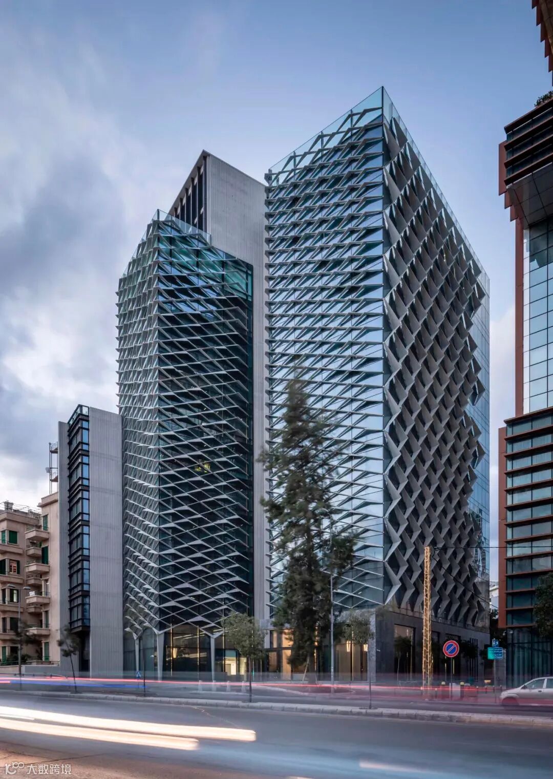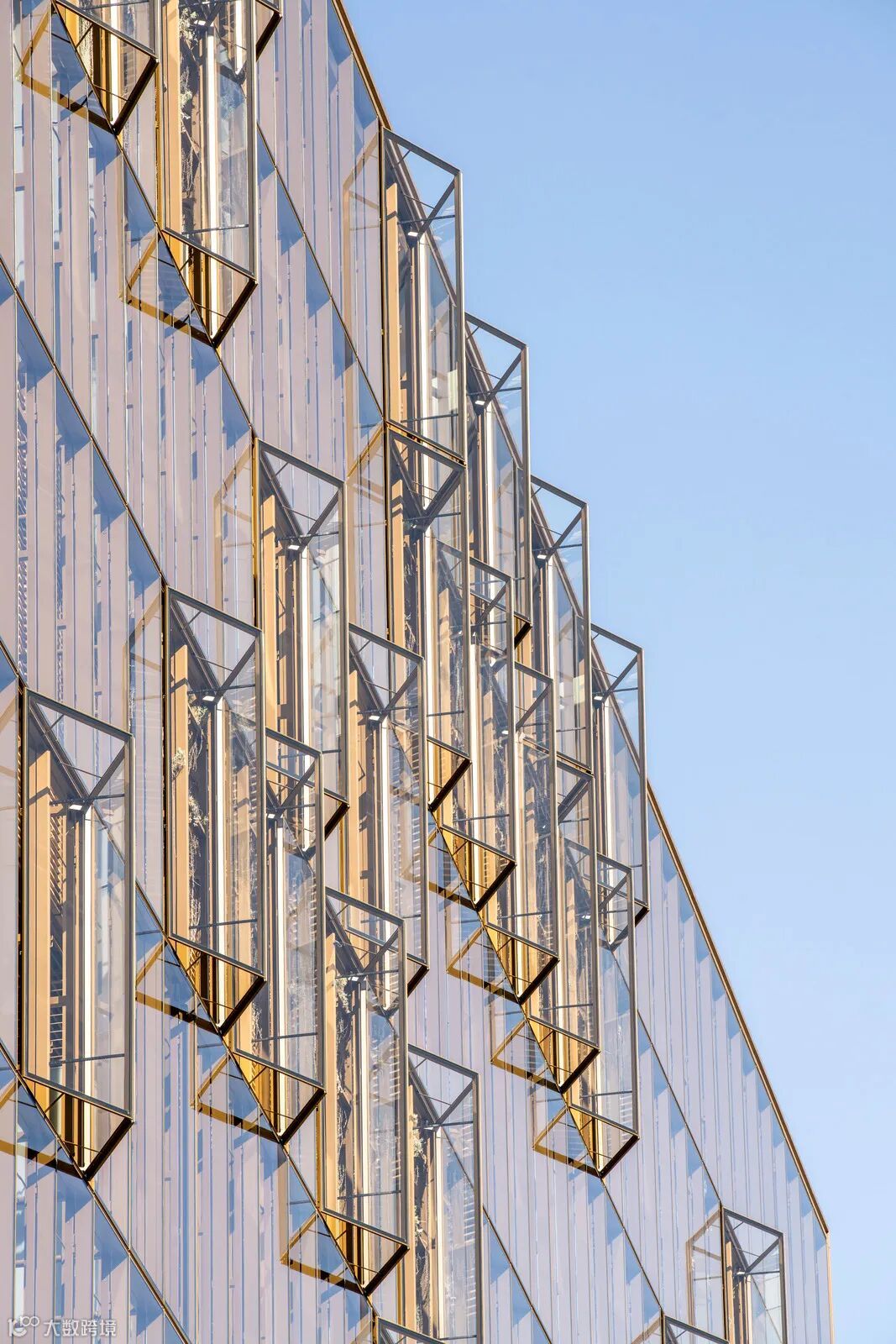定制的幕墙元素由菱形网格状遮阳板条组成,而每一个元件则都由玻璃纤维混凝土(GRC)打造、“悬浮”于玻璃表皮之上。