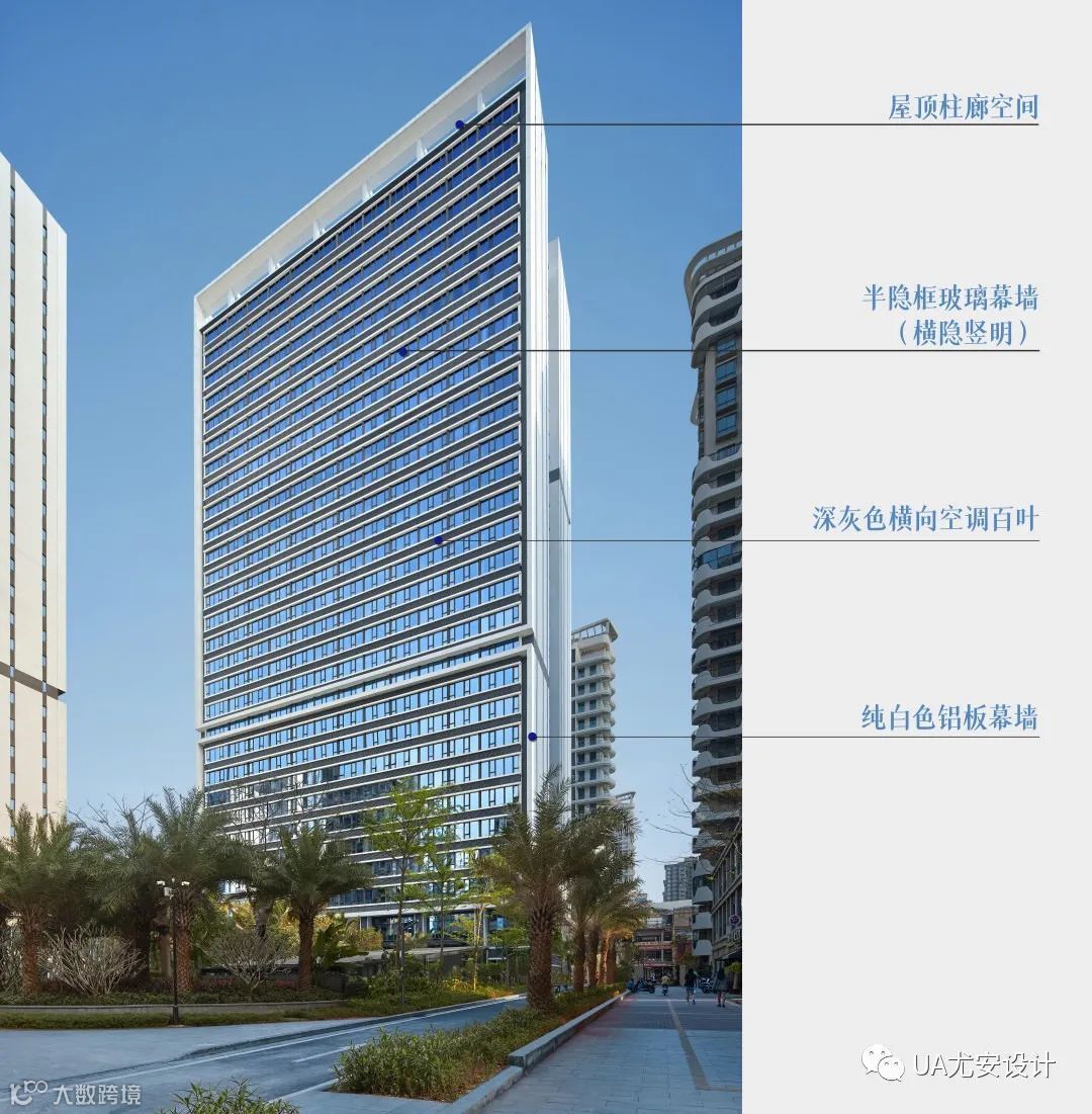 建筑主要墙面采用白色氟碳漆,玻璃幕墙结合造型铝型材,并辅以透明玻璃、金属格栅、局部采用彩釉玻璃、深灰色氟碳漆、LED 线条灯等增加立面的多样性。