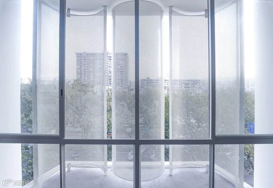 佛山 “七重花园”办公楼整体外立面为同一规格的弧形穿孔板和白色涂料,设计希望一种经济的方式呈现出单纯,明快的建筑形象。