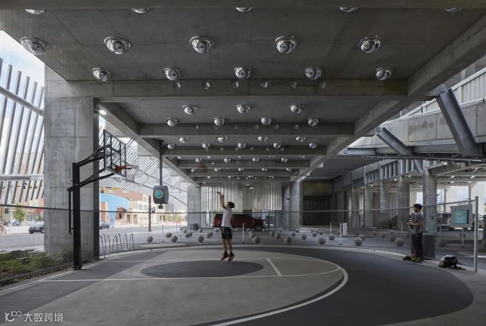 车辆入口的净空允许地下隧道进行维护,两侧为行人入口和自行车入口,以及篮球场等活动场所,它们激活了建筑临街界面,并且构成发展中的东村社区的南部边缘。