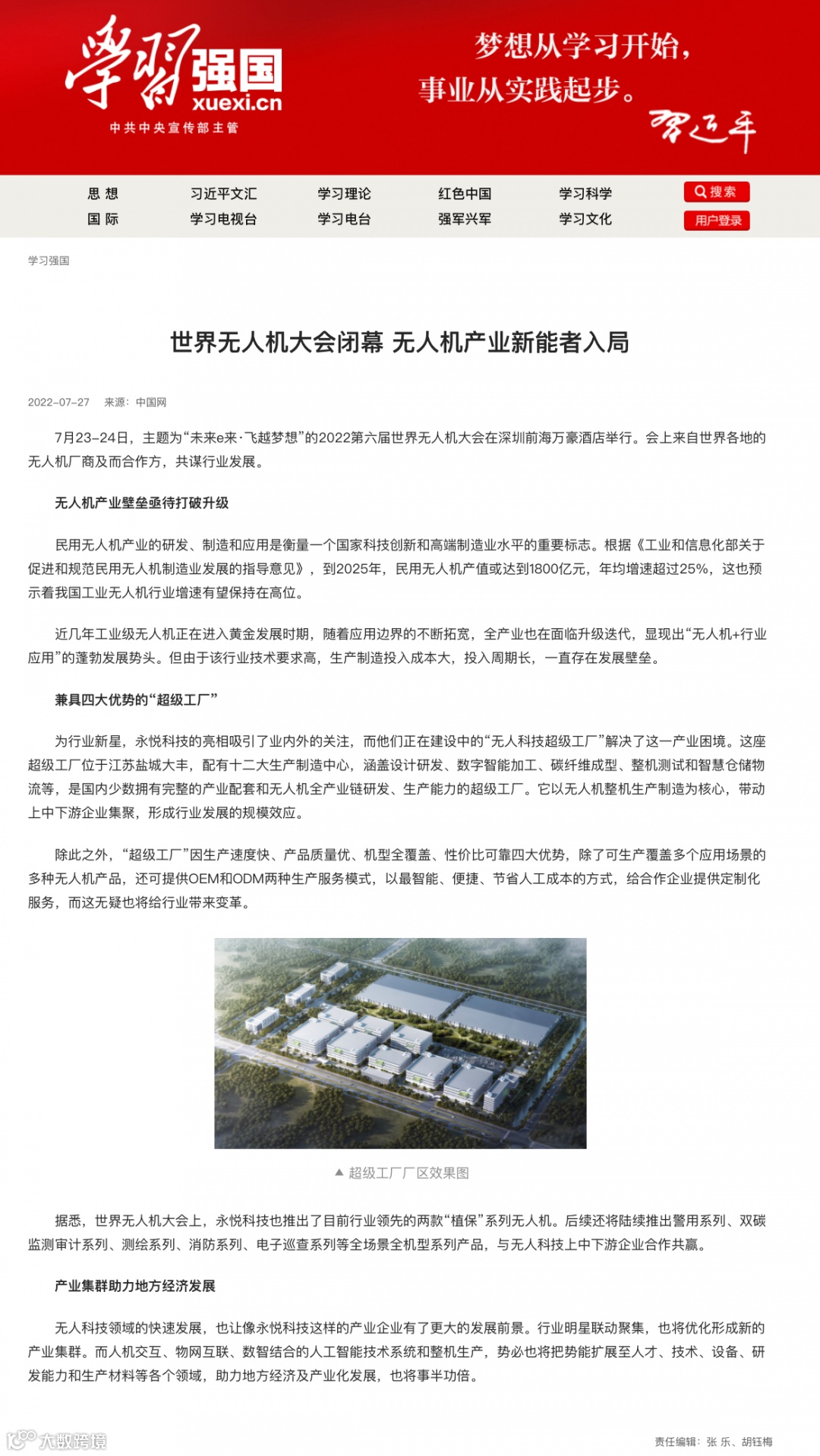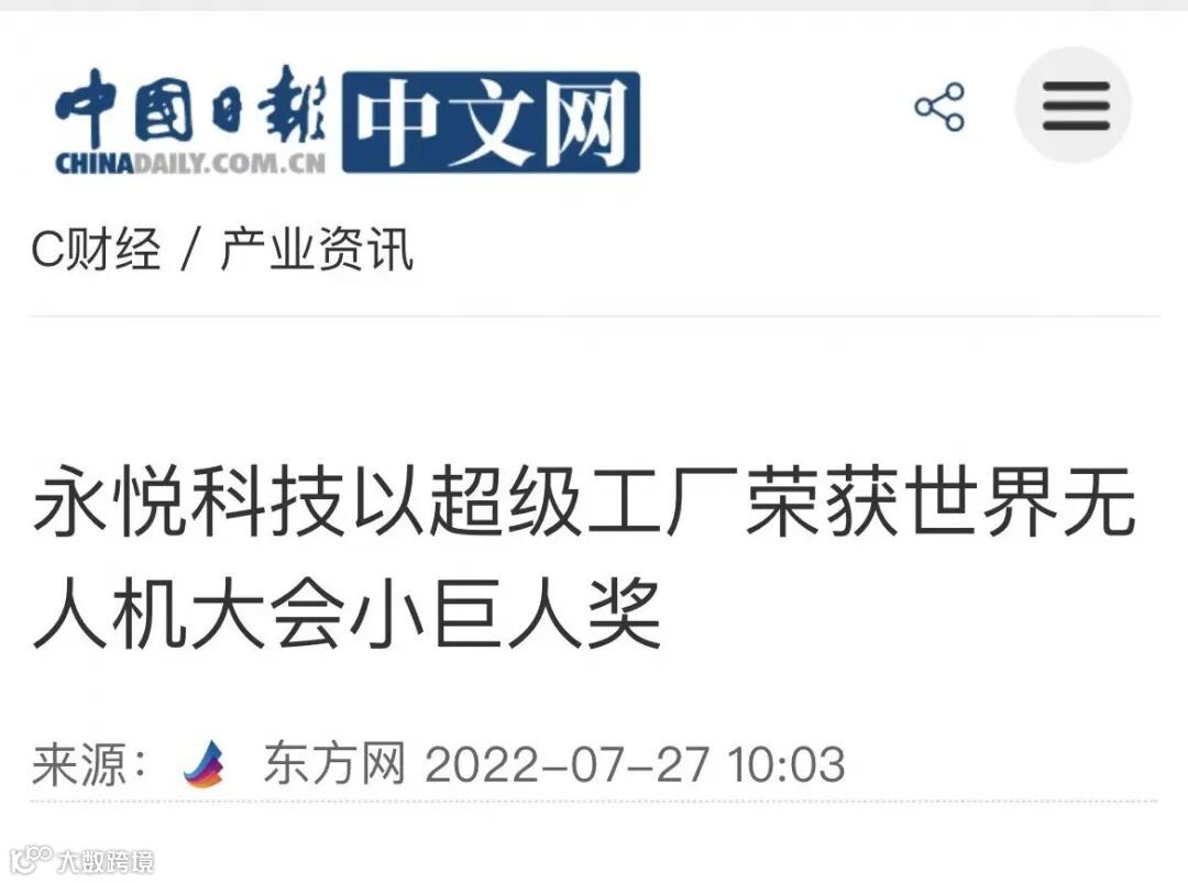 近日,永悦科技亮相2022世界无人机大会,凭借“超级工厂”荣获“小巨人奖”。人民日报、中国日报、澎湃新闻、中国报道、中国网、环球网等数十家国家级媒体对此事进行了报道和转载,“学习强国”学习平台更是对该报道进行了收录。