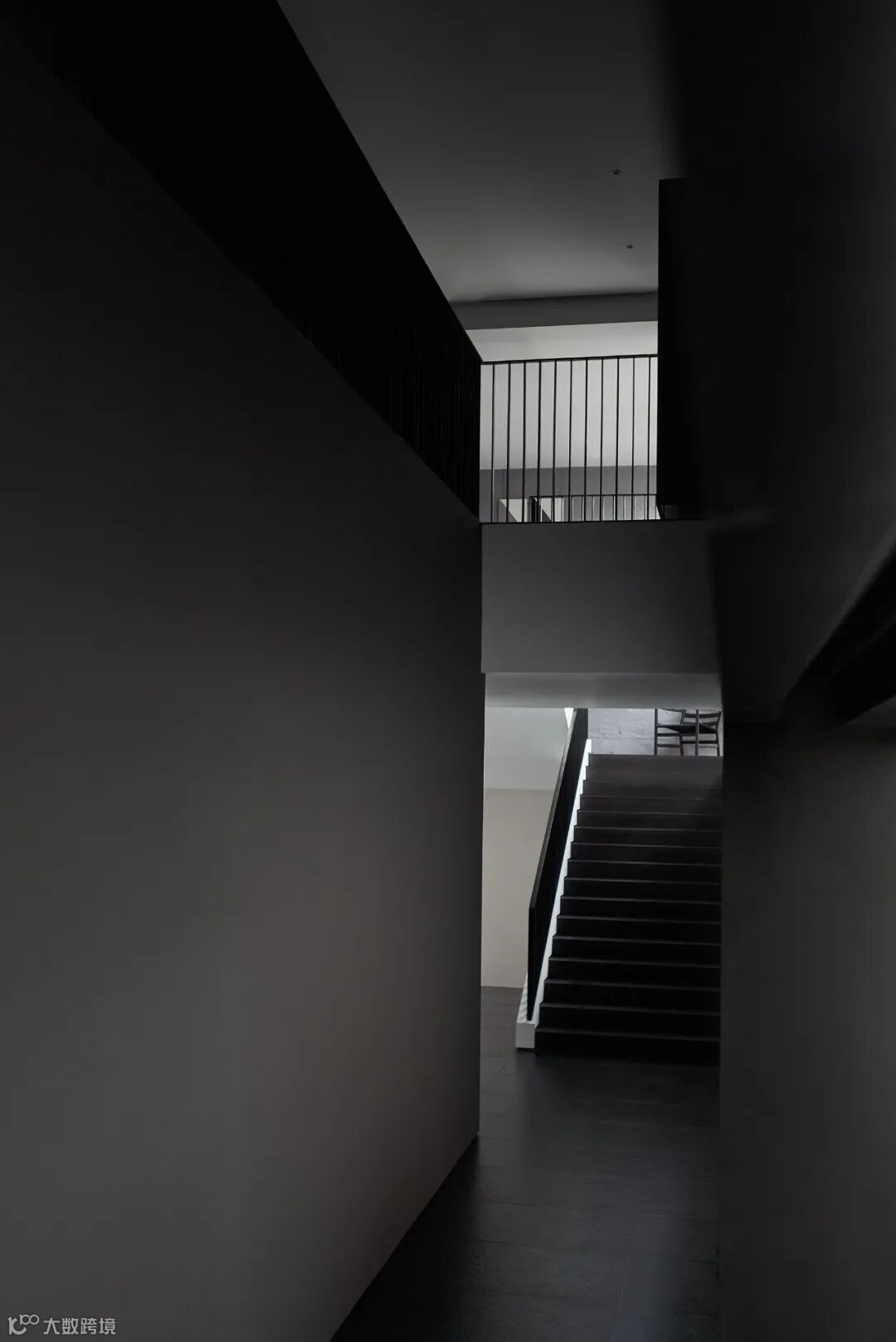 在L形的两个末端位置,也均设有楼梯,进一步提供便捷的垂直动线。端景处安放两列条状镜面,既方便整理仪容,亦能在映射中带来趣味。线形护栏则以极佳的韵律,自成一道靓丽风景。