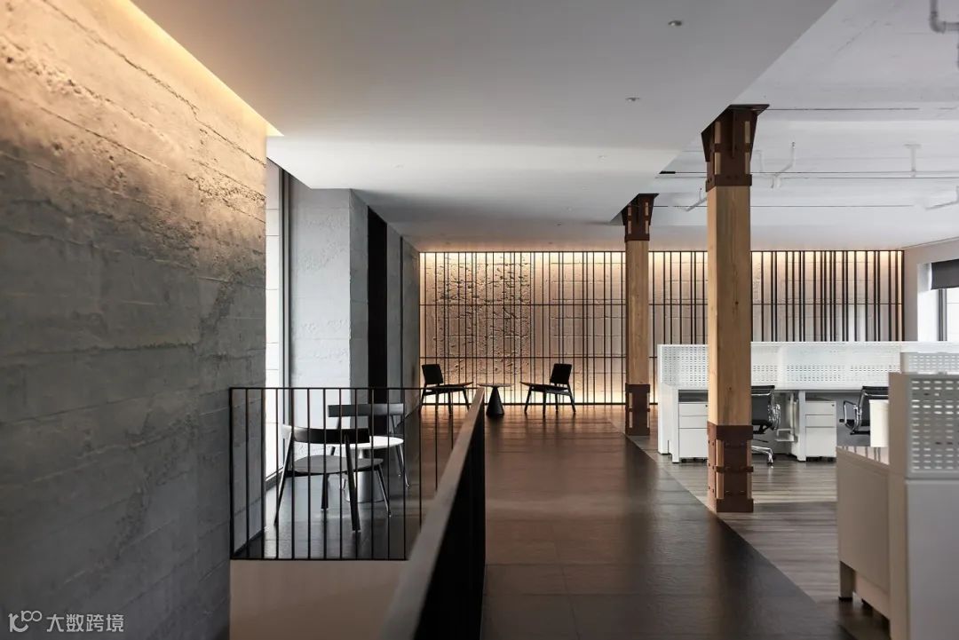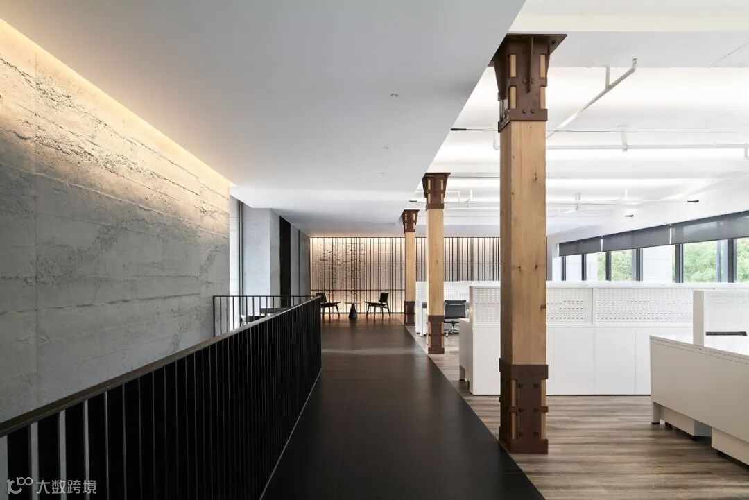 顺着圆弧楼梯抵达二层,两侧墙体以错位框景打破单调。连接两大开放办公区的通道随即映入眼帘,从实用性考虑,将原本的面宽适度缩减,并设置整面的暗藏柜体,删繁就简,旨在带来更优功用。