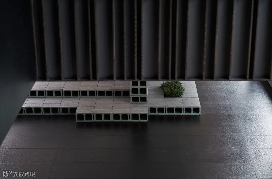 展示区选用了颇为常用的工程材料——空心砖,并以此堆垒出微缩版的楼宇形态,错落林立,却又浑然一体。产品也立于各自契合的位置,演绎出“远近高低各不同”的风景,统一之中又蕴藏变化性。即便后期展览主题更新,也同样可以机动转化。