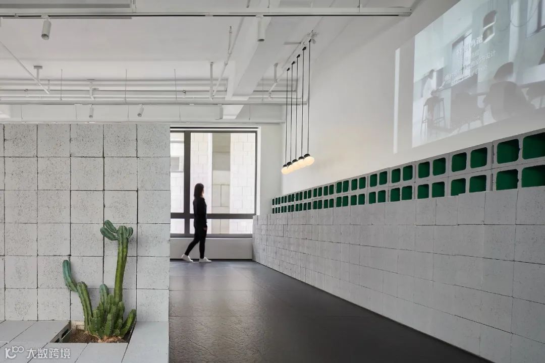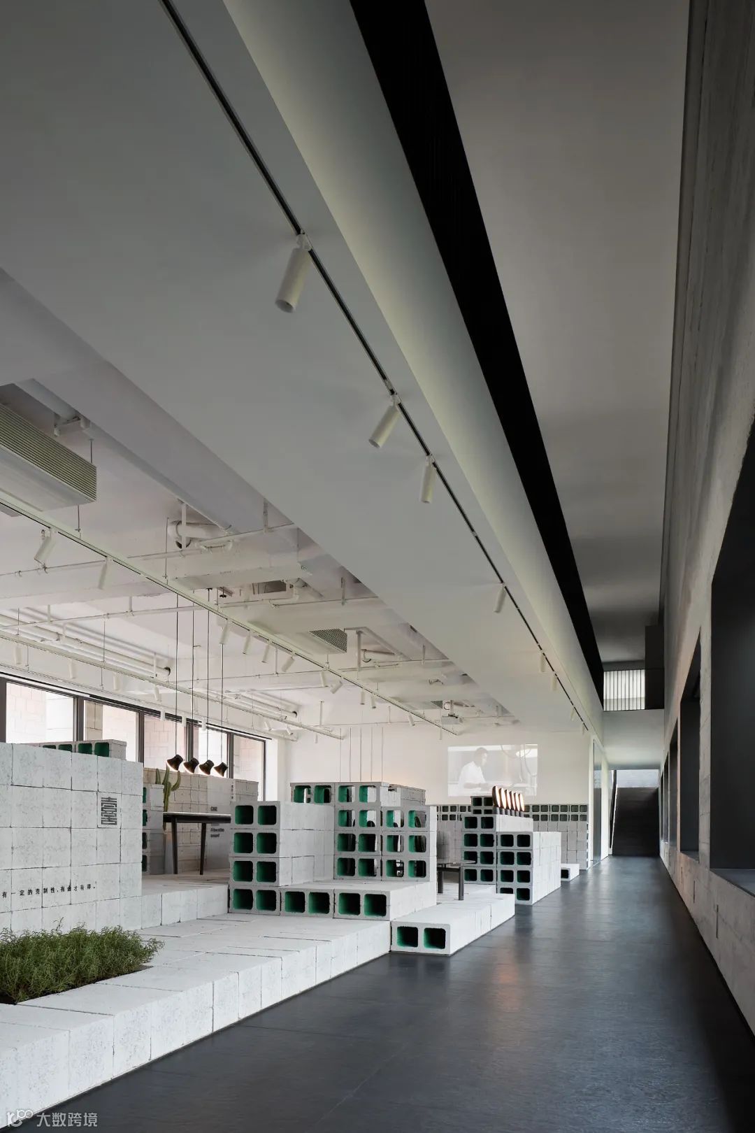 空心砖内壁涂以绿色装饰,蓬勃生机的植物同样散布于此,既不会过于跳脱,又有一定的互融性。展示区采用回型动线,每一个展示面都设有开口路径,可踏入内部。穿梭其间,借助动态的影像、静态的展陈、叙述的文字,进一步丰富人与场所、产品的关联,也传递情感与价值认知。