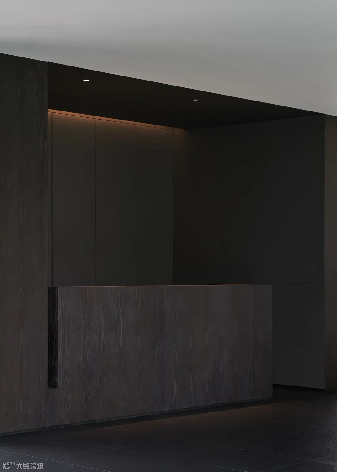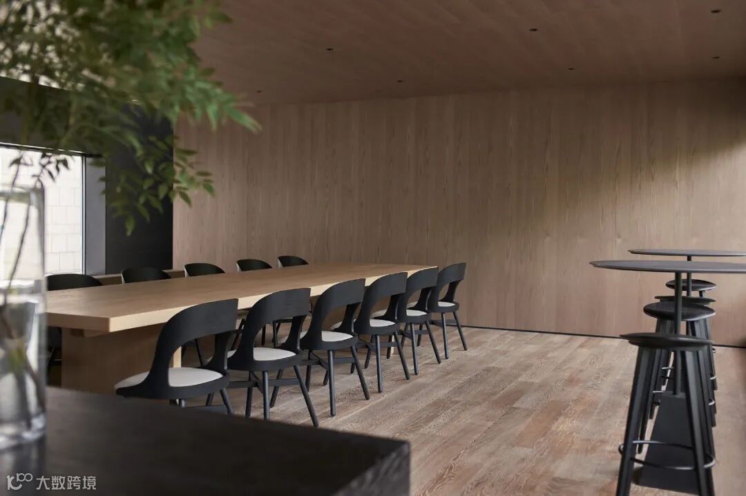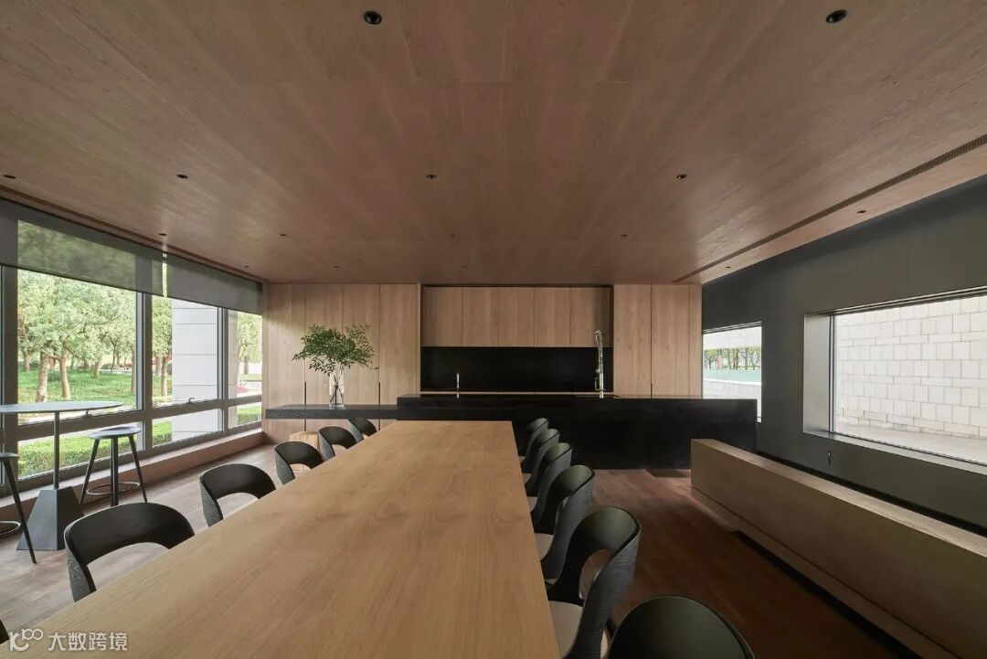 L型另一侧以深色为基调,旨在将外部的自然风光更从容的引入进来。移门划分沙龙区与会议室,彼此既可相对独立,又能联合一体,其可变性也为满足后续不同规模的情景使用创造了条件。