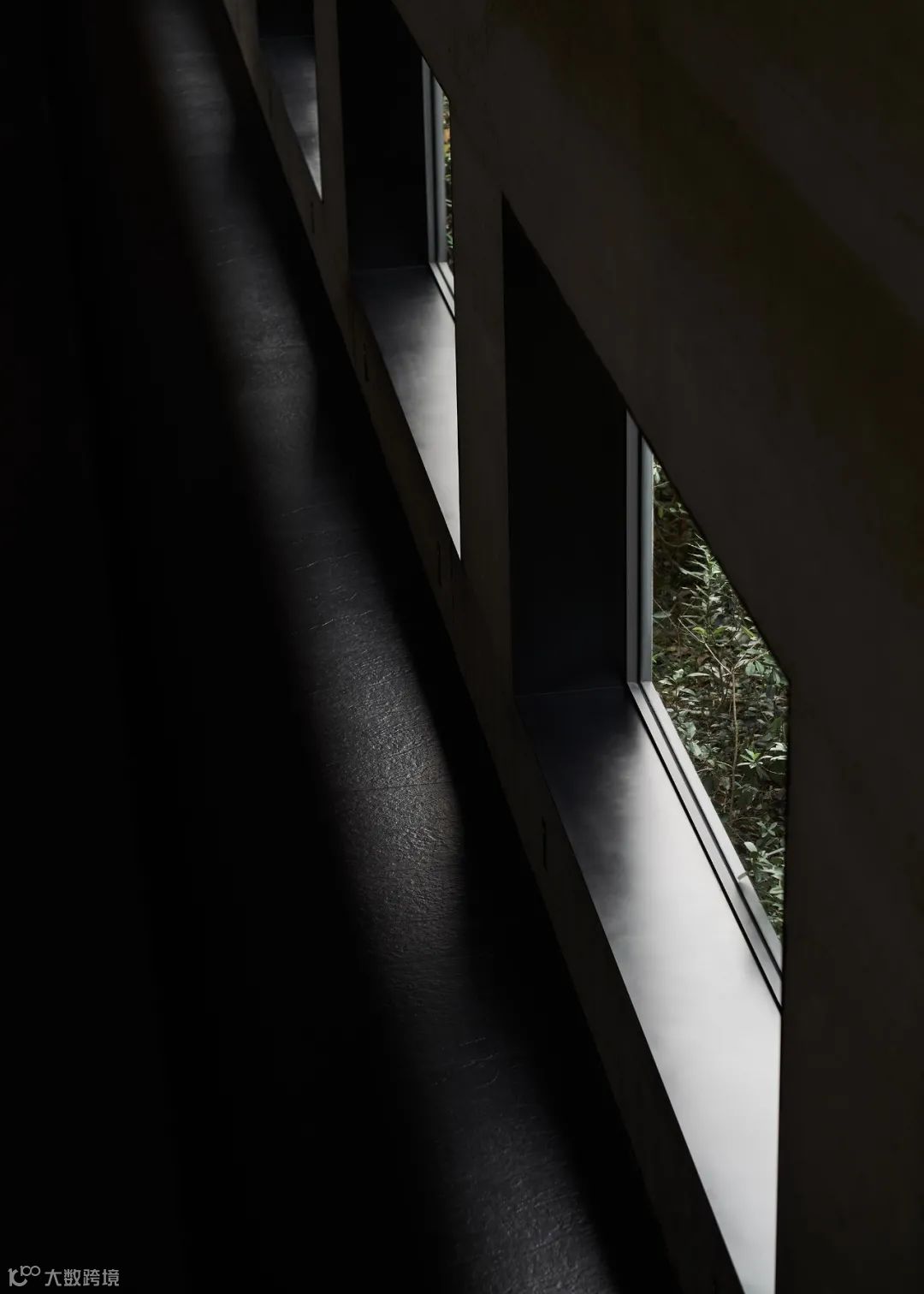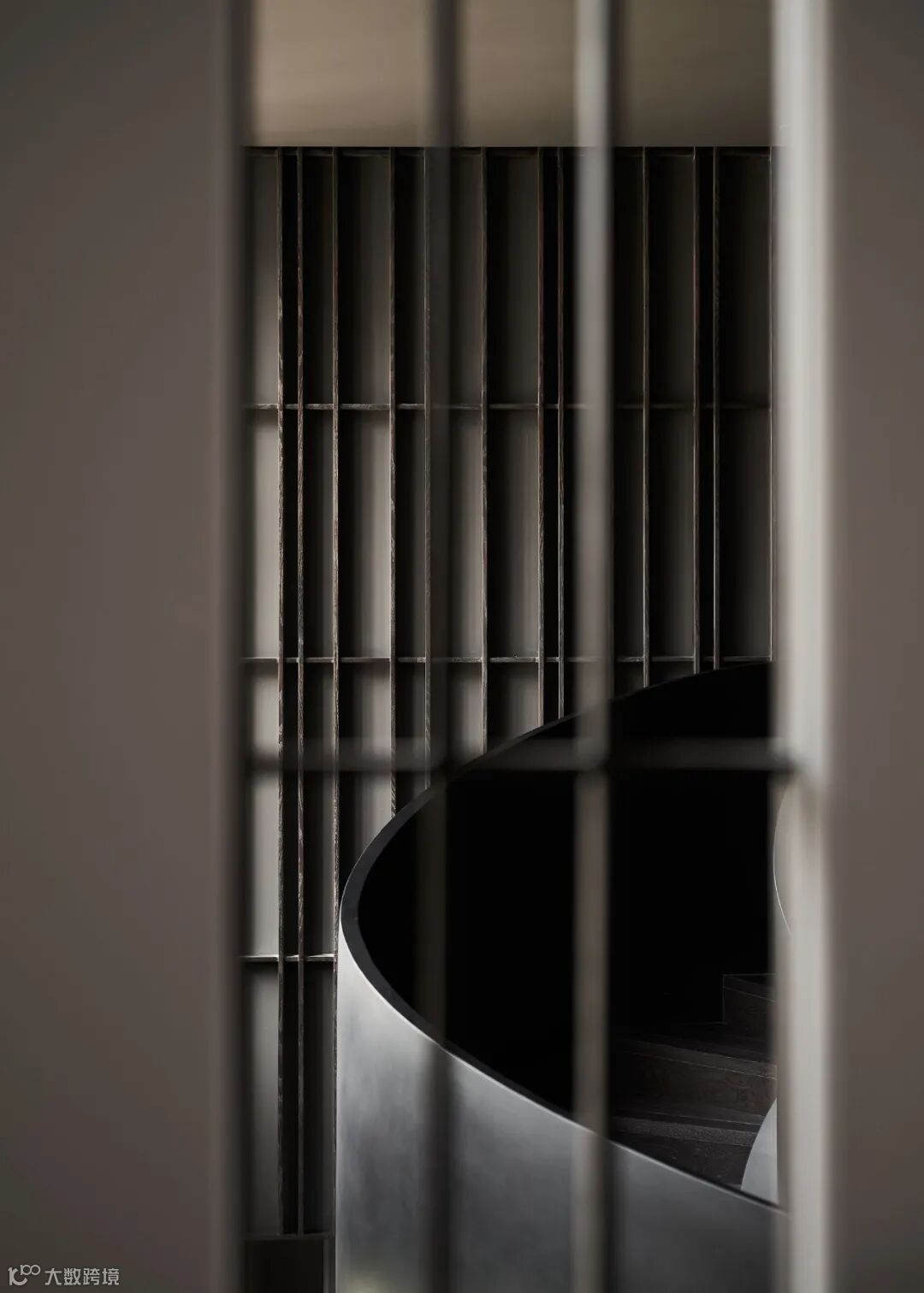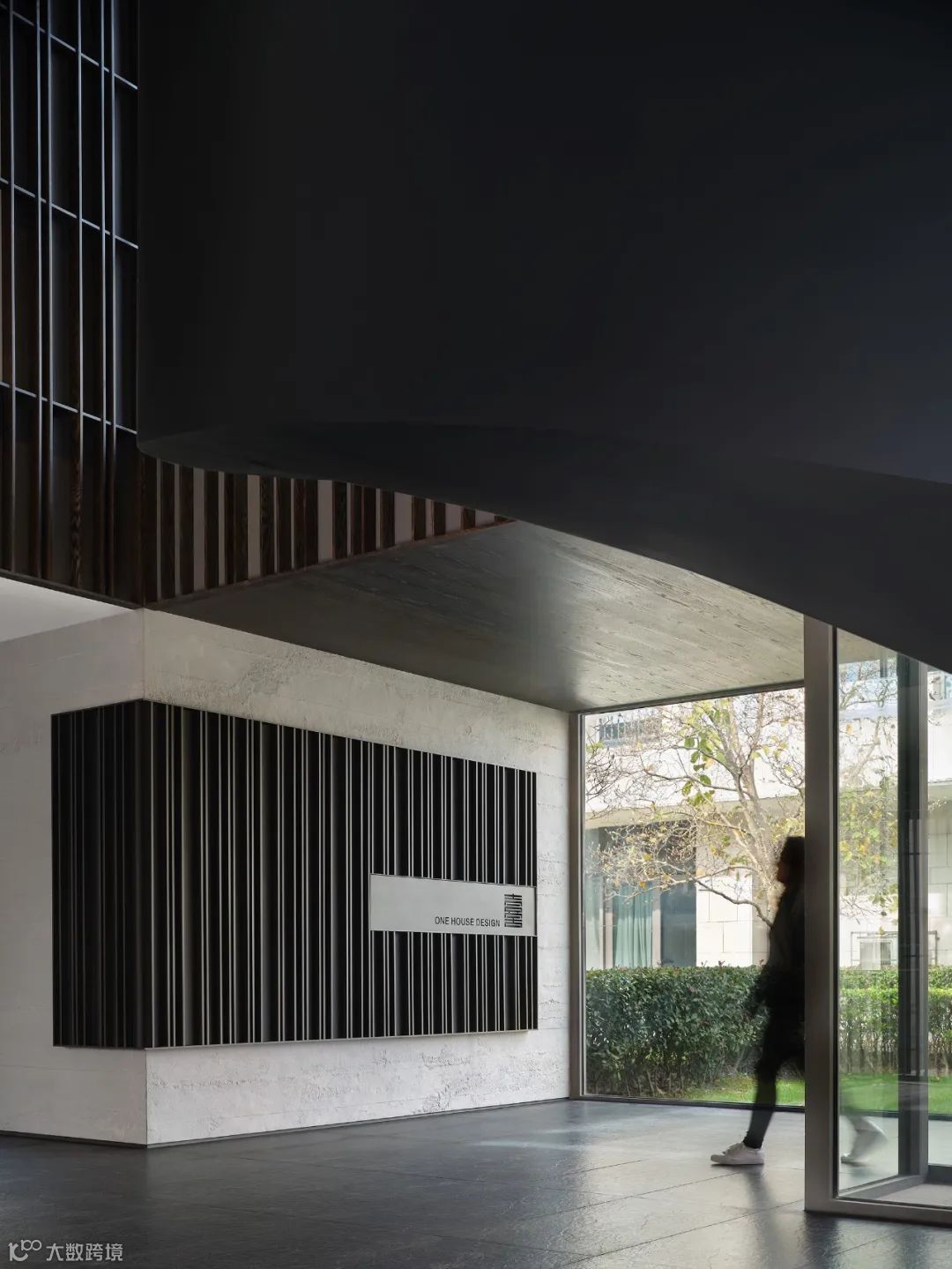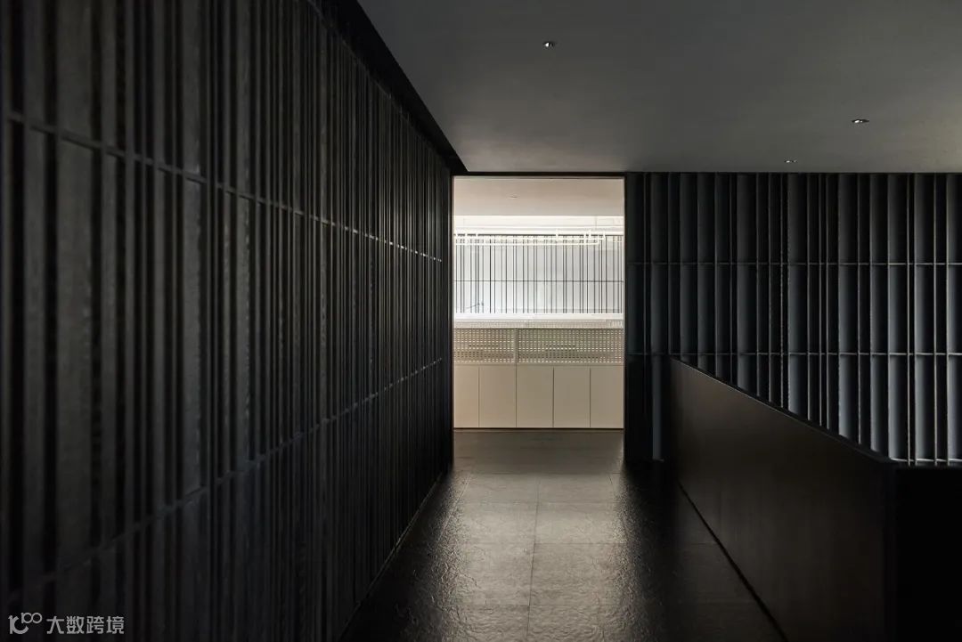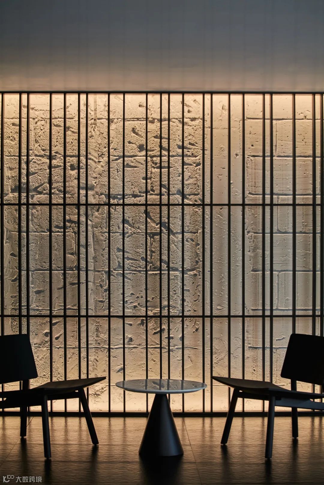 接待前厅上方覆以表皮形式,通过不同间隔的有序分割,既起到过滤作用,又不影响采光,还产生虚实结合与对比。这一元素以及处理手法同样贯彻于接待前厅的另一侧,透过借景方式,丰富这一隅的表达呈现。它是内敛含蓄的,也是通透开放的,张弛有度、随性自如。