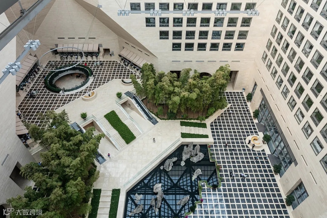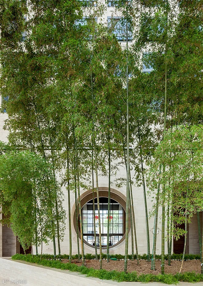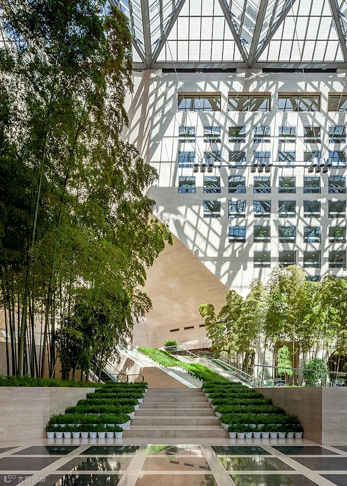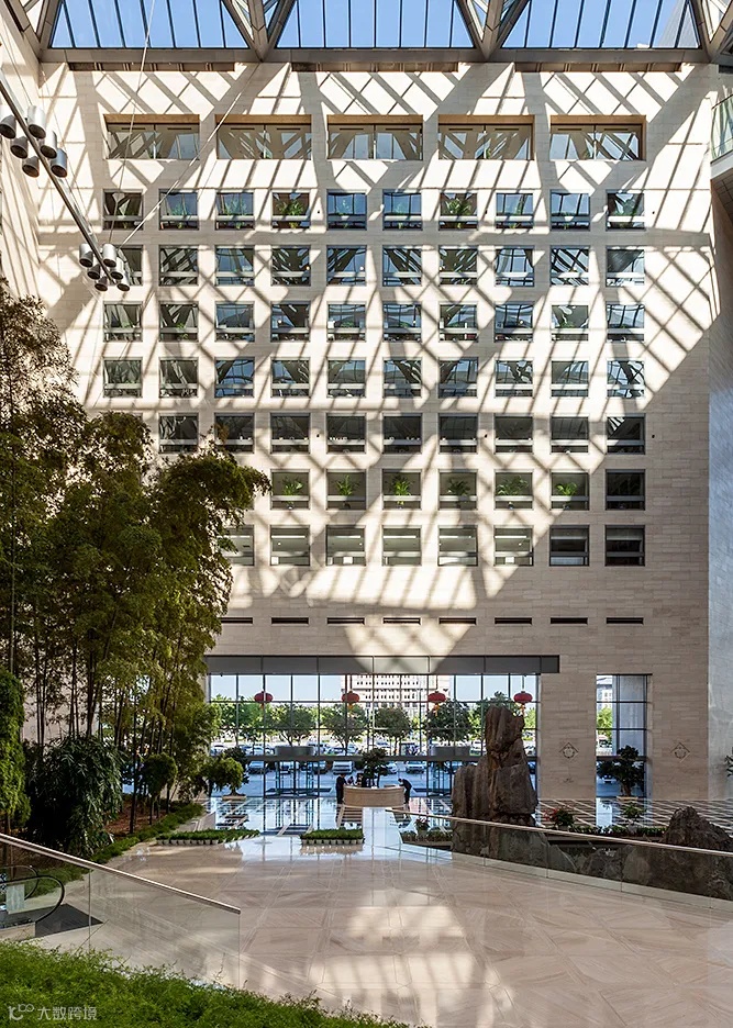 裙楼内部援以中式庭院的禅意,布置了一系列大小不一的庭院,使阳光、空气和景观贯穿于建筑之中,将游园的概念与内部流线相融合。底层开放的建筑空间和较低的地下室,为建筑内部提供了充足的光线和空气,庭院激活了建筑的全部楼层活力。建筑营造出的静谧氛围里,能够深入感受到传统园林“步移景异“的体验。