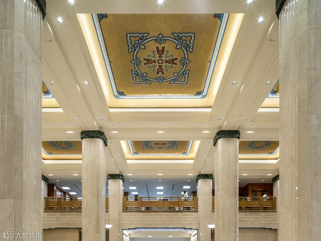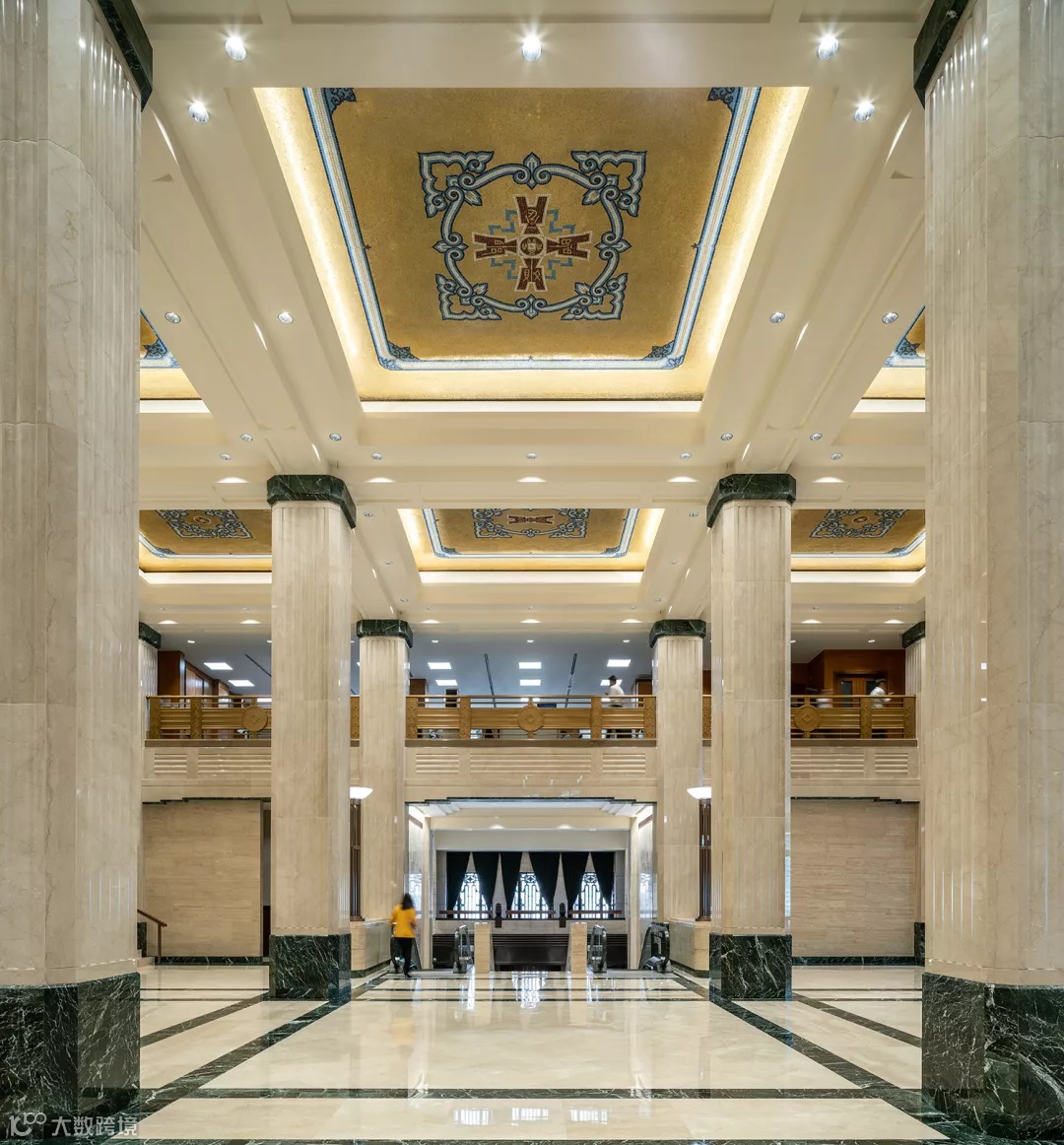 项目保留了原有建筑外观,仅在内部进行修缮。大堂的地面、柱子、墙面等均以原本的奶白色大理石为主,带来温暖、怡人的建筑氛围。修缮复原了屋顶的原本设计意图,同时,被改造成圆形的柱子也都复原为方形,与大厦外观的方形相呼应。