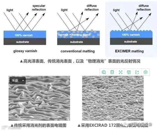 UV涂料配方中的丙烯酸酯双键在吸收172纳米紫外光后,可生成自由基而可以无需光引发剂。同时172纳米UV的穿透深度仅为100到500纳米,因此涂料只有表面极薄的一层被固化。这一薄层的聚合和交联,会发生收缩而形成不光滑的表面,并漂浮在未固化的下层液体上,达到表面哑光的效果,不过这个固化需要在氮气环境下进行,使操作环境的氧气浓度低于100ppm。后续再采用常规UV或者电子束进行完全固化。