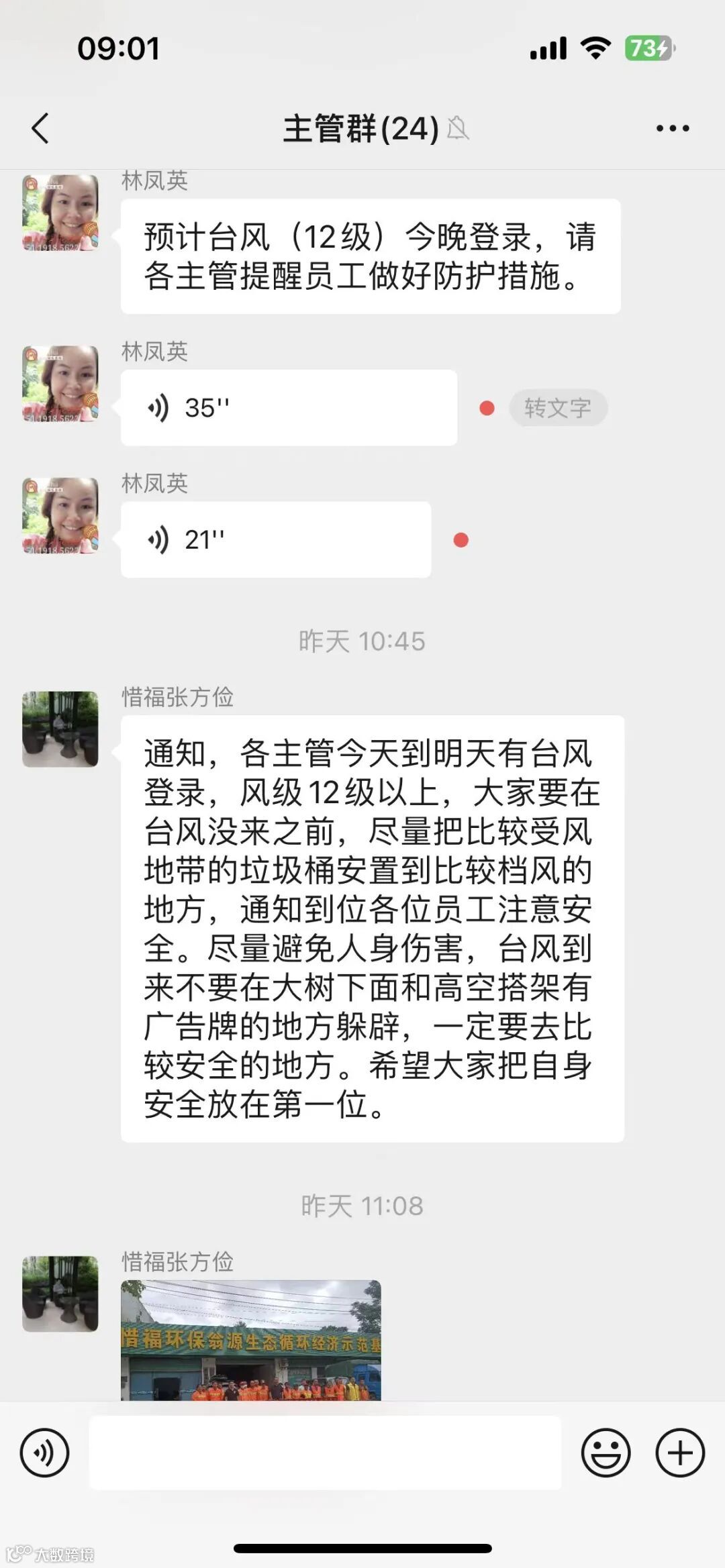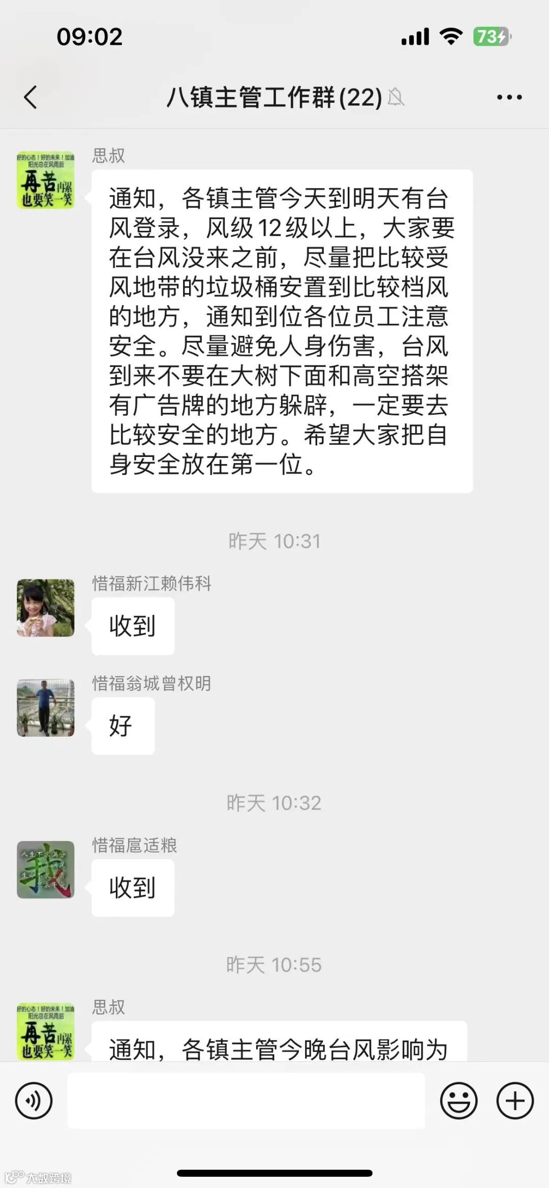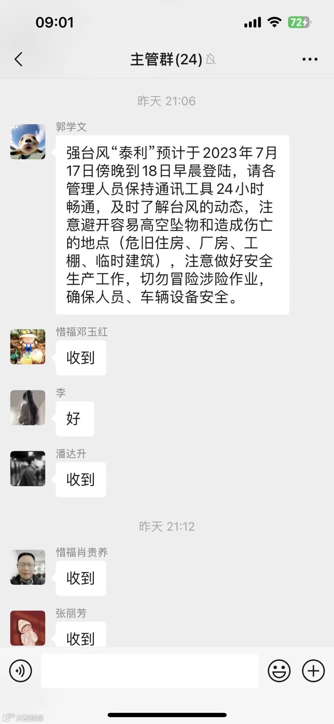 1、通过微信群,安全培训,实地巡查等方式,认真落实台风防御工作。