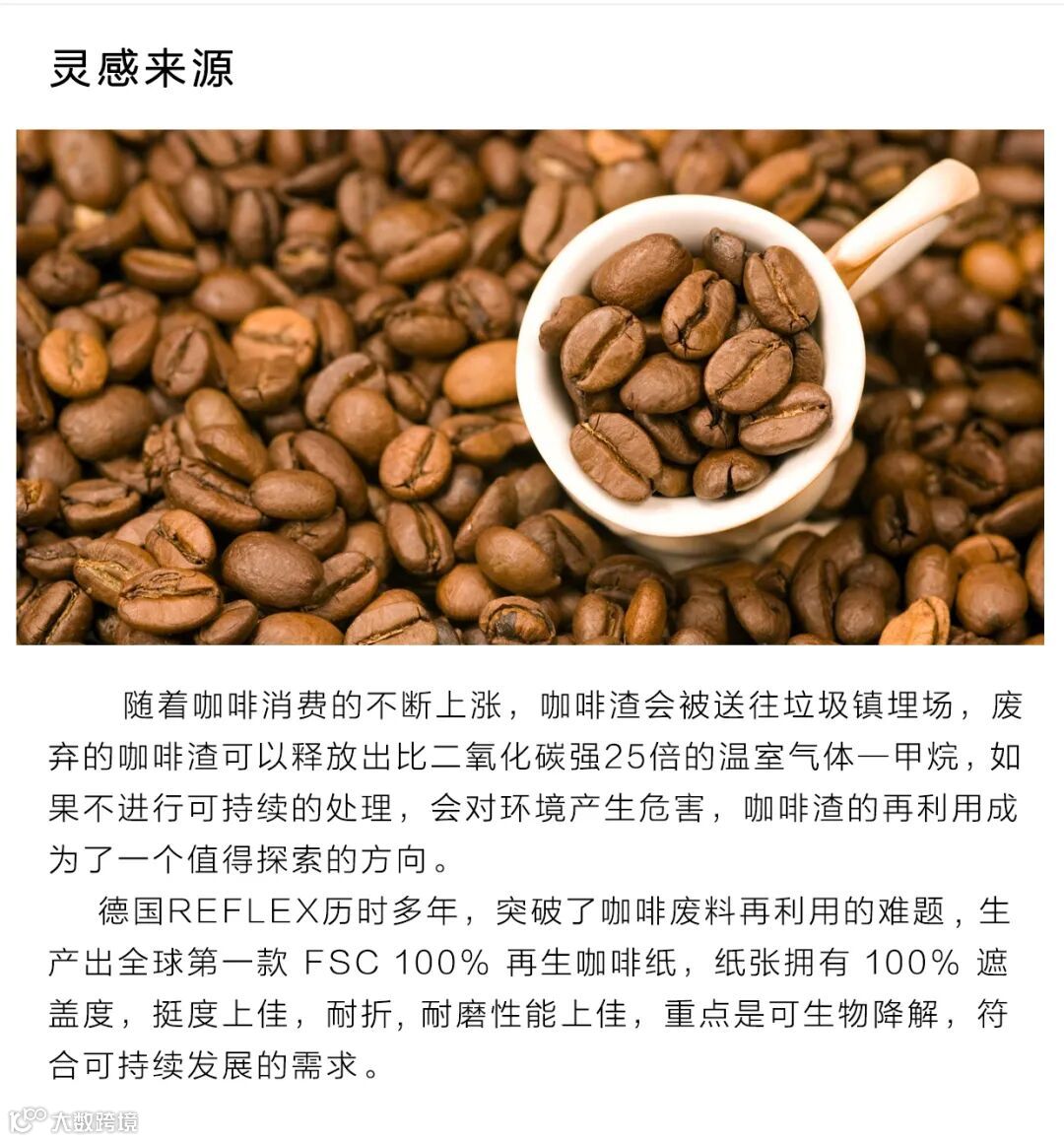 一款由95%的pcw再生纤维和5%的咖啡豆皮制成的纸张,其表面较为独特,呈现咖啡色原生态不规则的花纹,深邃的天然肌理加其舒适的手感,从内而外淋漓尽致地体现出原生态纸张的美好特性。