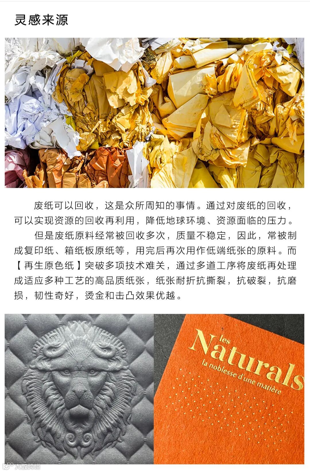 再生原色是一款拥有天然粗旷肌理的 100%再生色卡纸,拥有“蓝色天使”环保认证,有四个厚度选择,可一次成型无需裱合。纸张挺度极高,且耐折耐撕裂,松厚度高达1.5c,烫金和凹凸效果奇佳。15哥极具冲击力的颜色加上独特的粗旷纹理,凸显原生态的高级质感。
