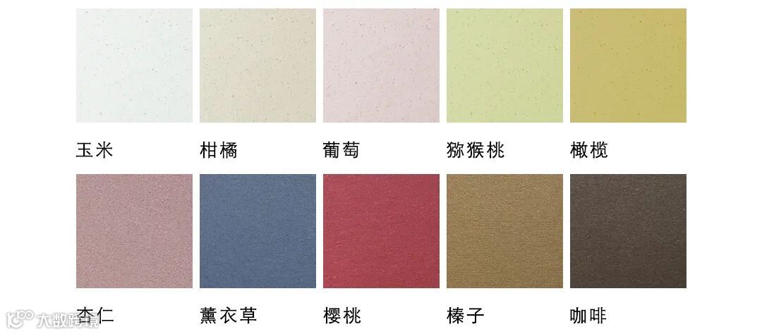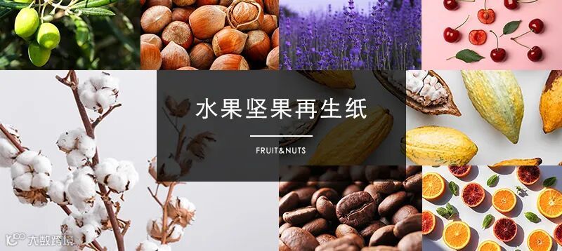 水果和坚果再生纸用有机植物水果的加工残留物替代15%的木浆。成分内含包括柑橘类水果、葡萄、樱桃、薰衣草、玉米、橄榄、咖啡、猕猴桃、榛子和杏仁。这些天然材料从垃圾堆里被提取出来并制作,采用了比标准回收工艺更加先进的环保制造工艺。
