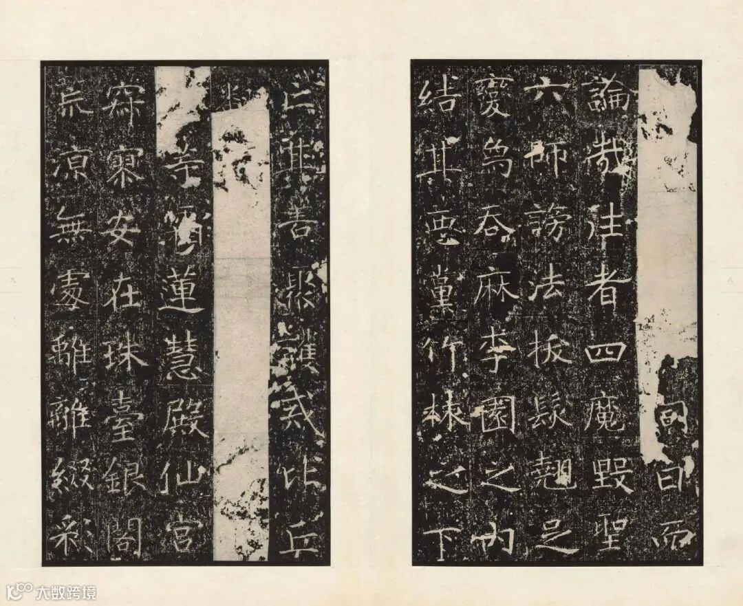 《龙藏寺碑》刻于隋开皇六年(五八六)。碑现存于河北正定隆兴寺。碑高一百五十六厘米,宽八十九厘米。碑额高四十二厘米,宽三十一厘米。碑阳正文楷书,三十行,行五十字;碑阴题名楷书,共六截,三十行,各行字数不等;碑额亦楷书,三行,行五字。