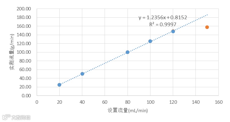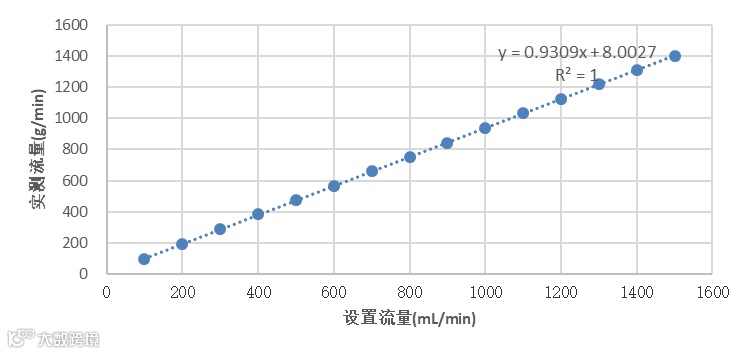 精进三柱塞泵可输送低粘度甘油至1500mL/min;从目测观察,>400mL/min出液口有一定抖动,无法定位是粘度导致还是稳定性下降;全流量范围内线性关系良好