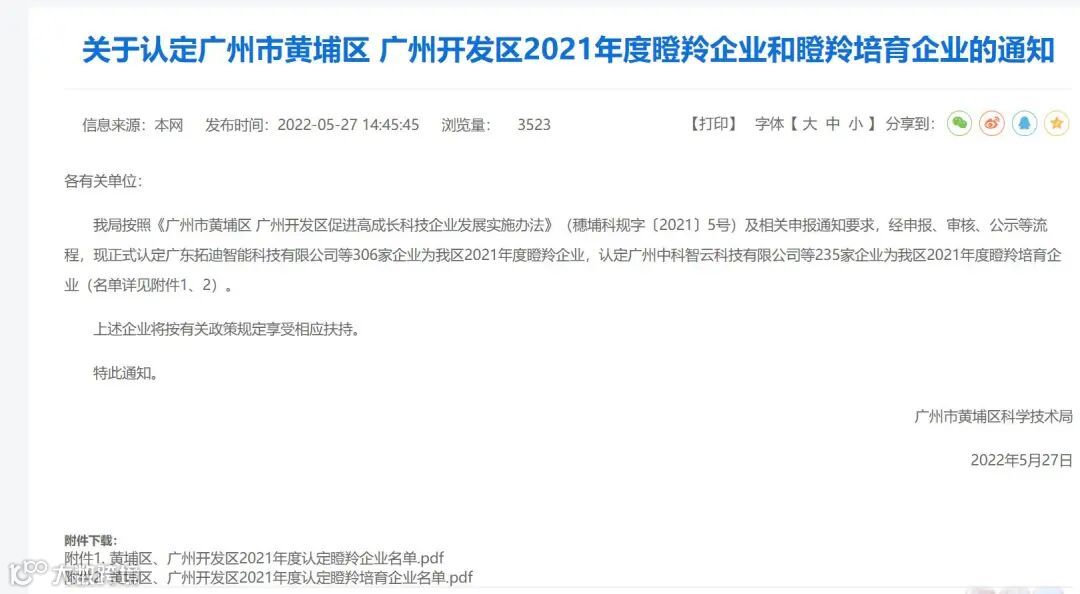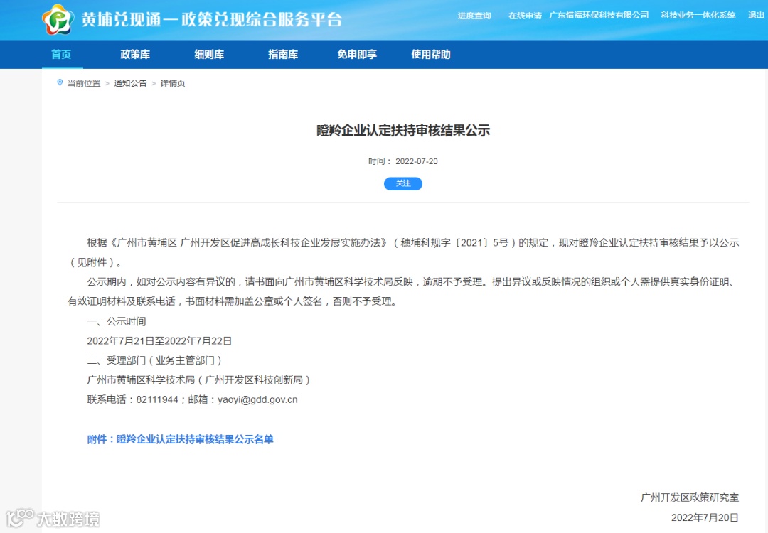 广东惜福环保科技有限公司近日被广州市黄埔区 广州开发区认定为“2021年度瞪羚企业”。