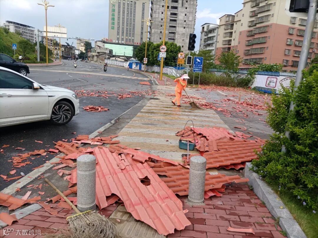 清理突发台风后地面大量垃圾树叶树枝,杂物