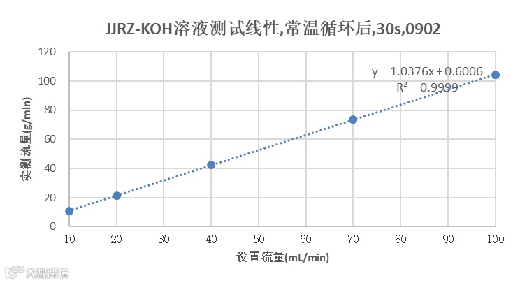 应客户需求,使用JJRZ-20020S泵输送1mol/L KOH溶液,评估该泵在常温及加热条件下输送碱性溶液的流量稳定性,并考察物料在泵内静置后是否存在结晶堵塞风险。
