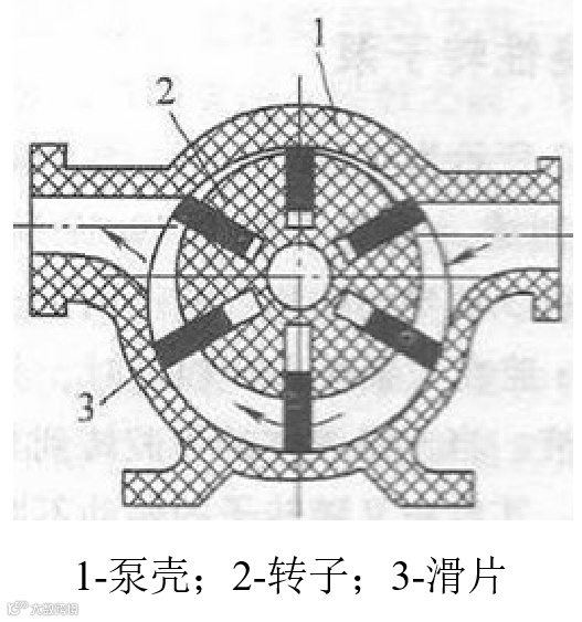 滑片泵又称刮板泵(图2-11),是容积式泵的一种。转子旋转一周,滑片在槽内往复一次,完成一次吸入、排出过程。若制成偏心距可变化的结构,则可以调节流量的变化。