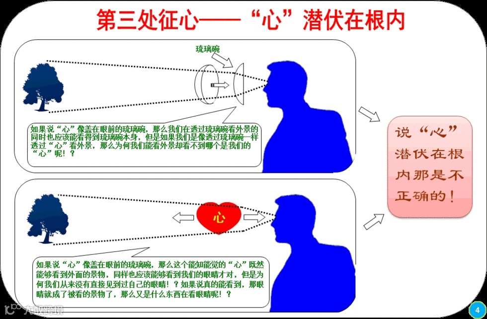 佛告诉阿难:如果你的心和眼镜一样潜伏六根,向远看,可以看见山河大地,朝近瞧可以看见眼镜,但为何却看不到自己的眼睛呢?如果能够看到眼睛,那么眼睛就如同外境,这下子糟糕了,眼根变成所见所缘了,跟你没关系了。既然如此,怎么能说觉知的心潜伏根内呢?所以你说觉知心潜伏根内,像琉璃眼镜一样的说法是不正确的。
